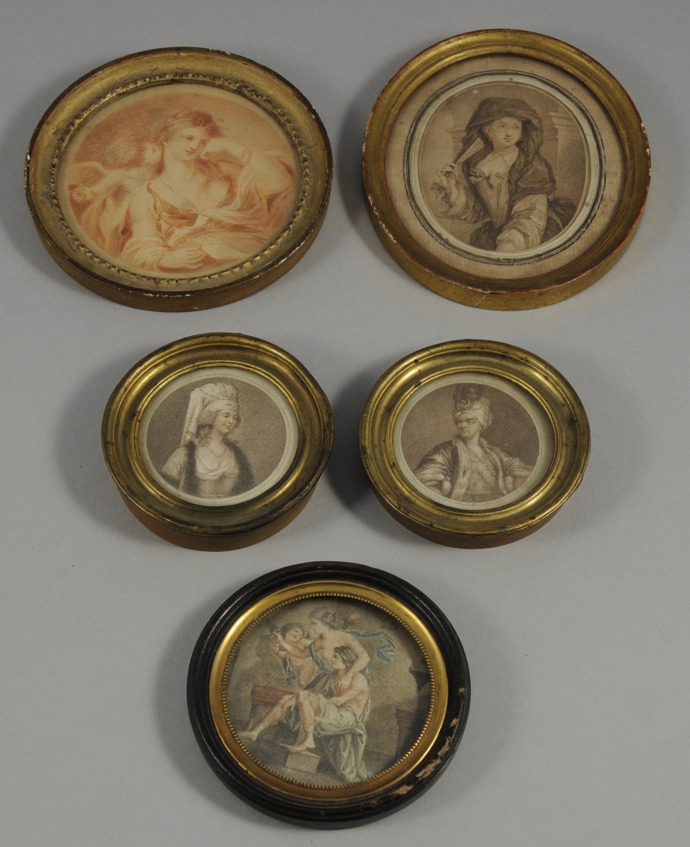 Réunion de CINQ MINIATURES: Femme à l'éventail, Femme accoudée avec un angelot, Jeune couple guidé par l'Amour, Portrait d'homme et portrait de femme à la mode ottomane en pendants. Gravures. Cadres de bois mouluré et doré, ou cerclés de cuivre doré, sous verres.