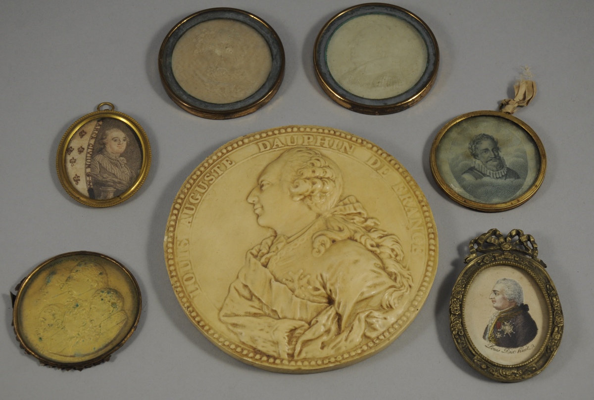 Plaque portant les effigies de Louis XVIII, Charles X, du duc et de la duchesse d'Angoulème, et du duc de Berry. Elle porte une inscription: "Illustres descendants d'Henri IV Sur vous repose le bonheur de la France" (cuivre repoussé et doré), Diam. 7 cm