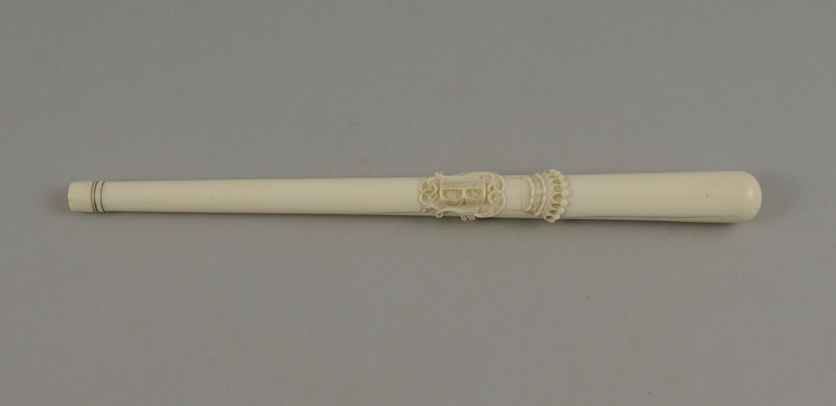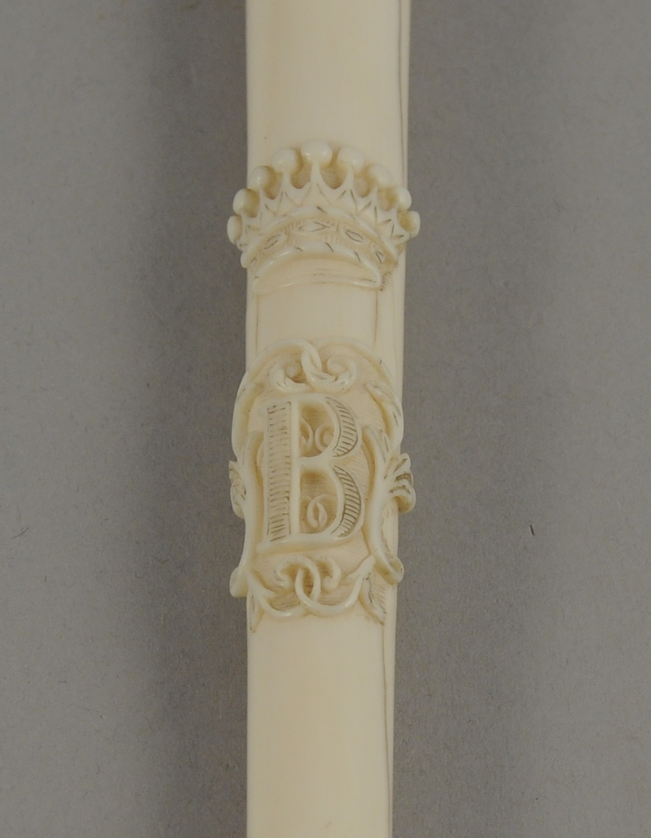 MANCHE d'ombrelle en ivoire sculpté. Décor au chiffre " B " dans un encadrement en volutes feuillagées, surmonté d'un couronne comtale. Extrémité taraudée.