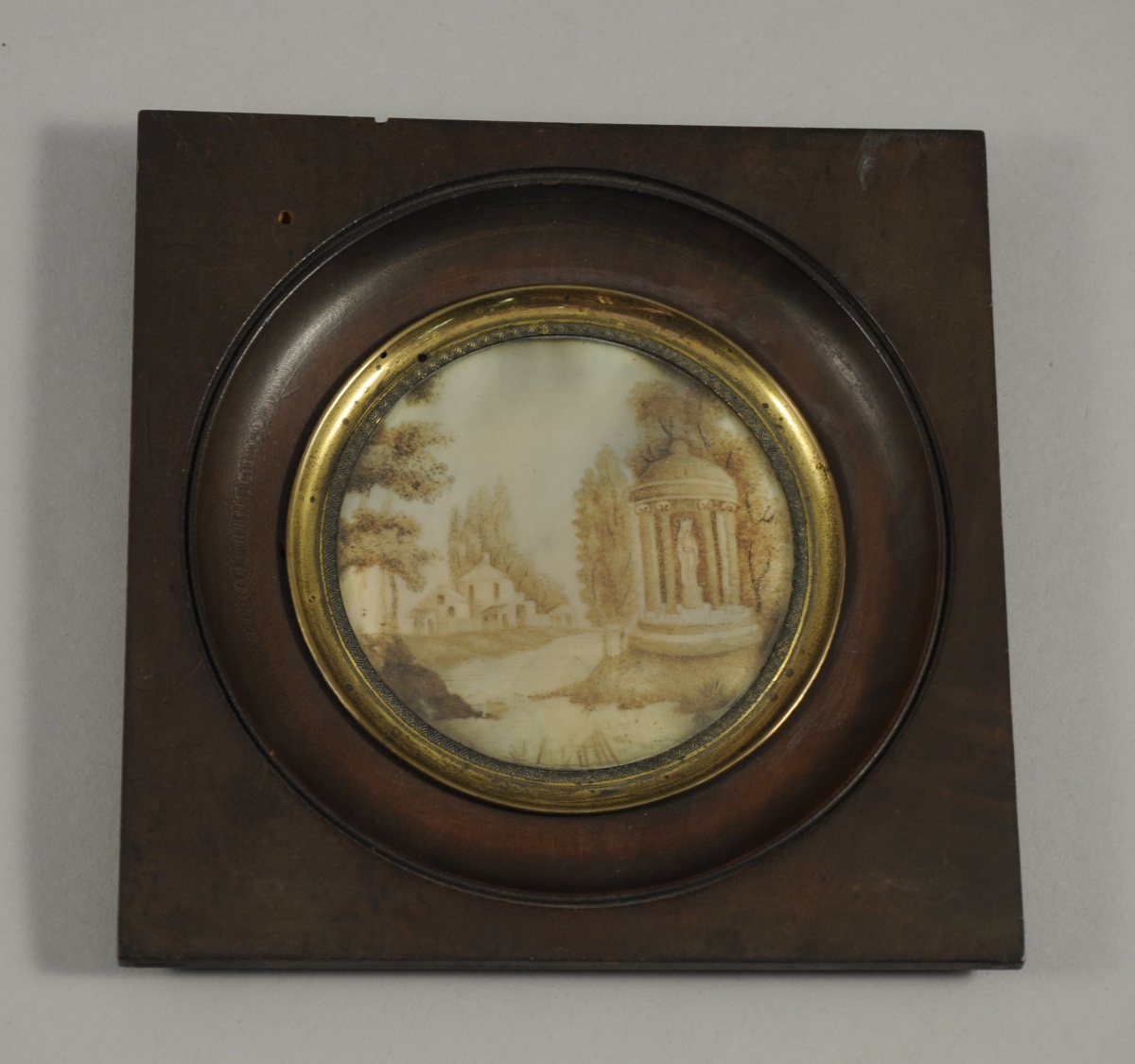MINIATURE sur ivoire et poudre de cheveux représentant un paysage composé d'un petit temple au bord de l'eau et d'arbres. Cadre carré en bois teinté et baguette de laiton circulaire.
