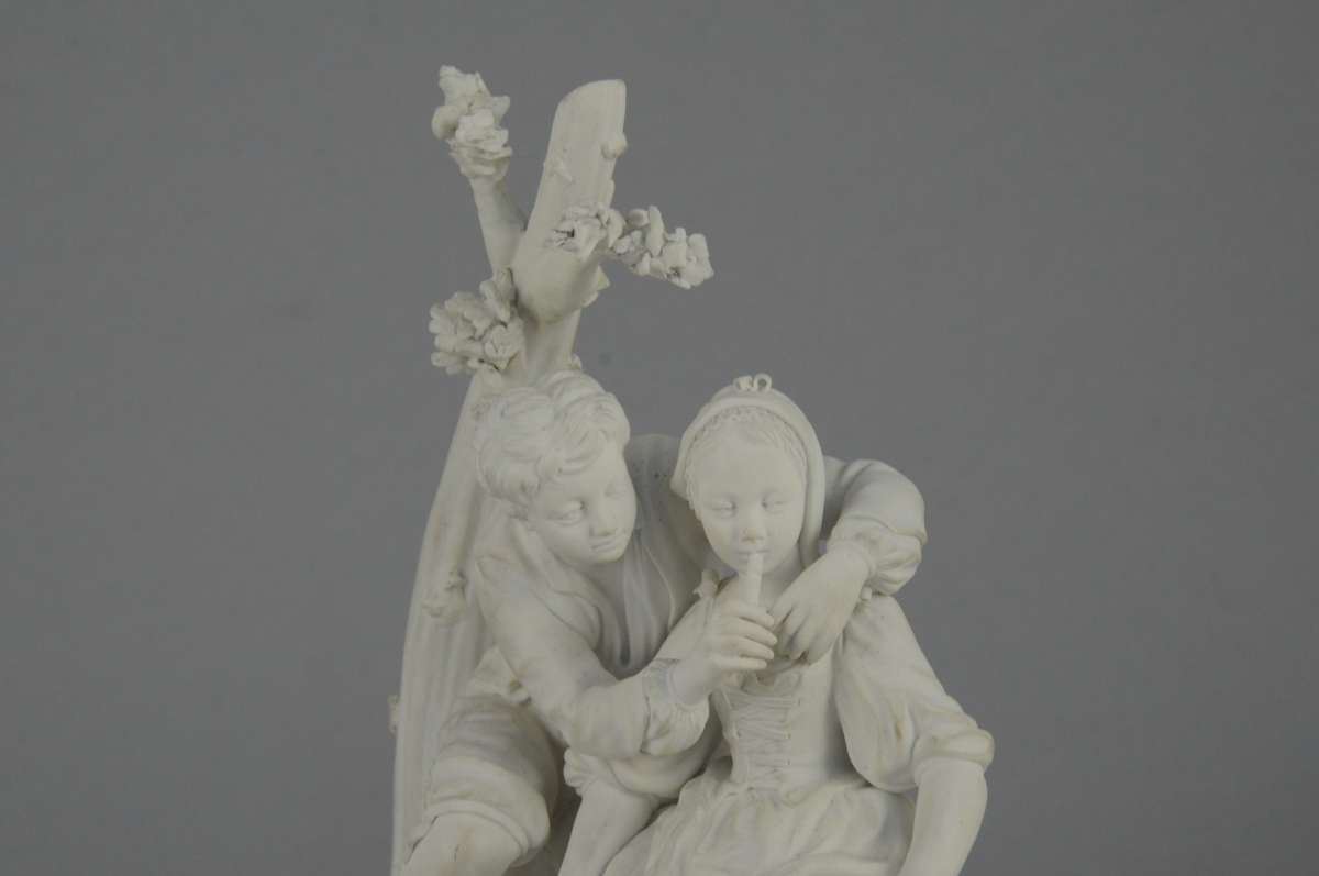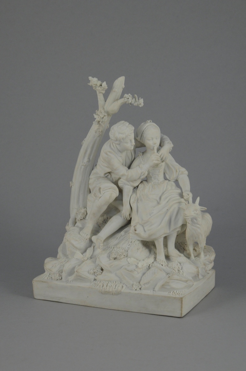 Groupe sur socle rectangulaire, en biscuit de pâte dure. Un jeune homme et une jeune fille sont assis sur un rocher orné de fleurs et feuillage, auprès d'un arbre, une chèvre debout à leurs pieds. Le jeune homme se penche vers la jeune fille et tient sa flûte sur sa bouche afin de la faire souffler.