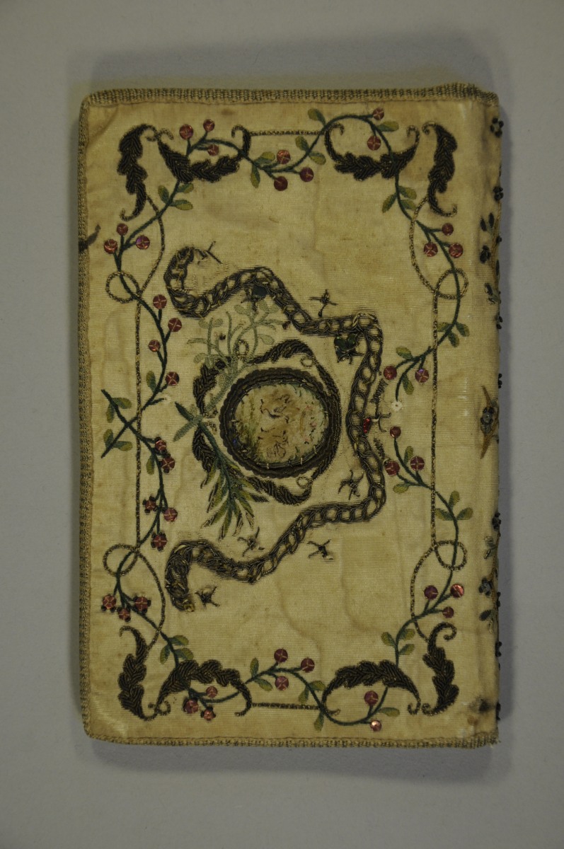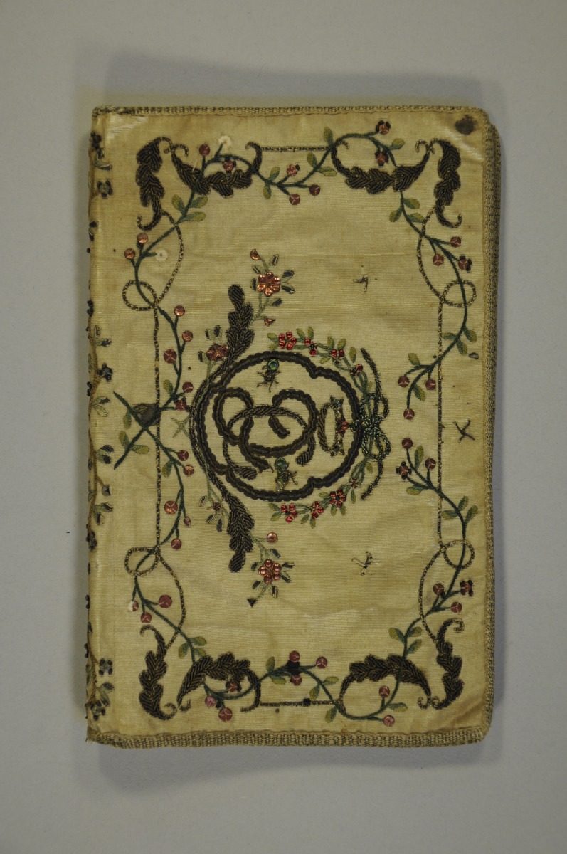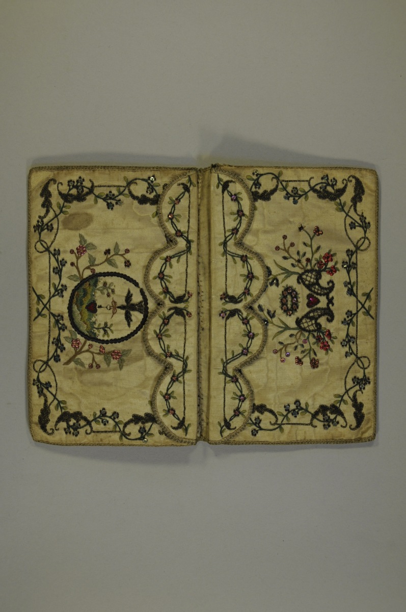 PORTEFEUILLE en soie beige brodé de motifs floraux en fils de couleurs et paillettes. L'un des plats porte un monogramme surmonté d'une couronne, dans un cartouche surmonté d'un nud de rubans ; l'autre plat est orné d'un dessin à l'encre sur vélin figurant deux oiseaux, dans un cartouche agrémenté de branchages. À l'intérieur, quatre poches dont deux à rabats, avec décor d'un oiseau tenant un cur par un lien dans un cartouche.
