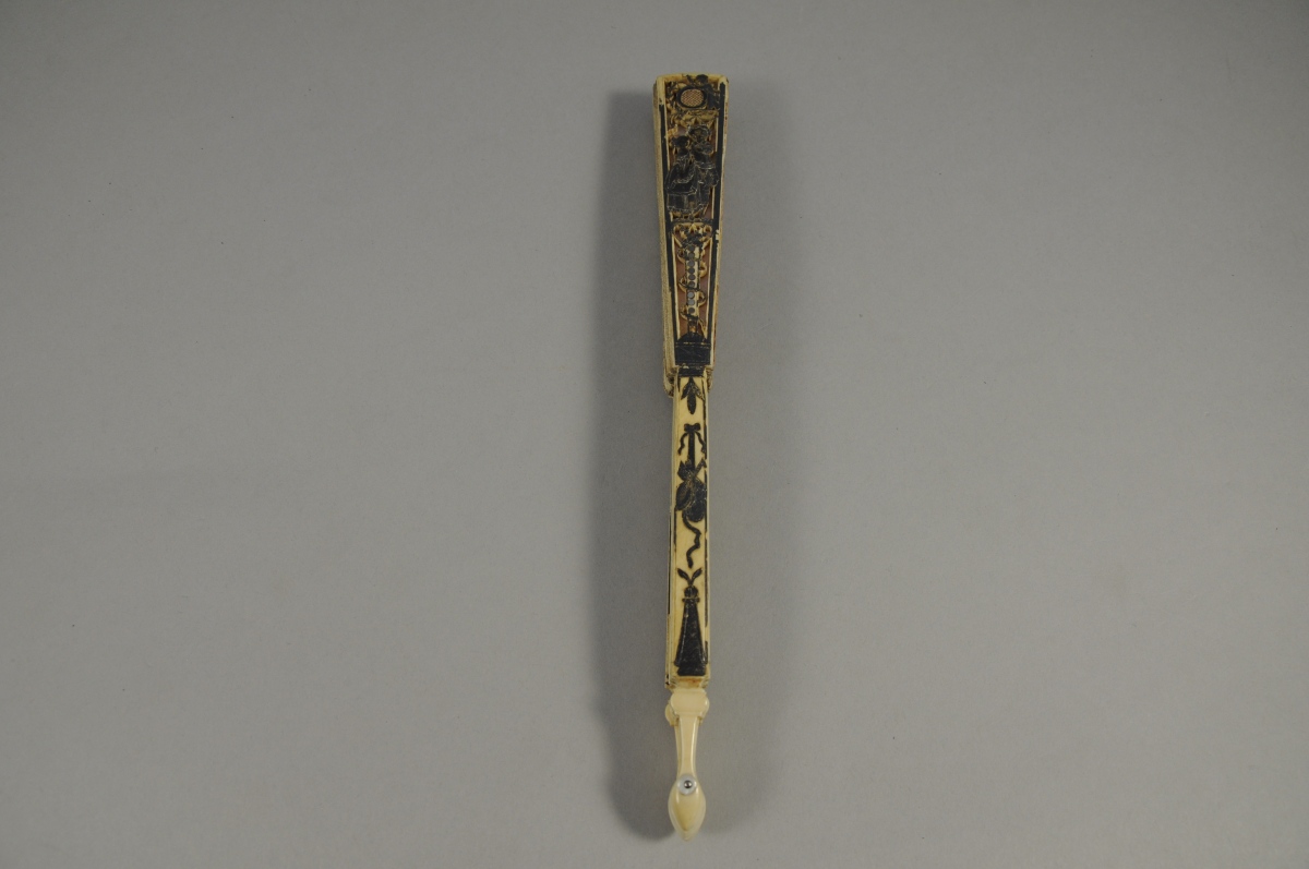 ÉVENTAIL de type brisé en ivoire et papier peint à la gouache, à décor d'une assemblée de bergers et bergères sur un fond de paysage. Sur les bords, bouquets de fleurs polychromes et rinceaux dorés sur fond en treillage. Au revers, un soupirant auprès de sa belle dans un paysage lacustre. Monture en ivoire découpé à jour, ornée de putti, de couples et de trophées de musique.