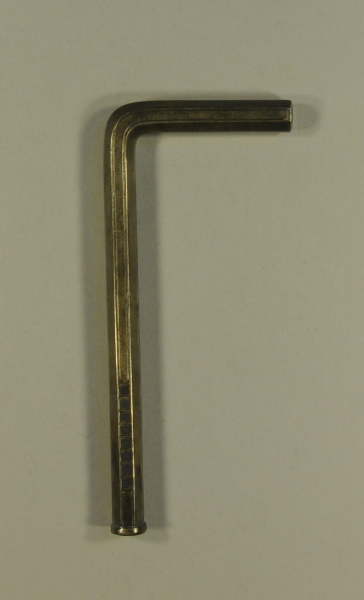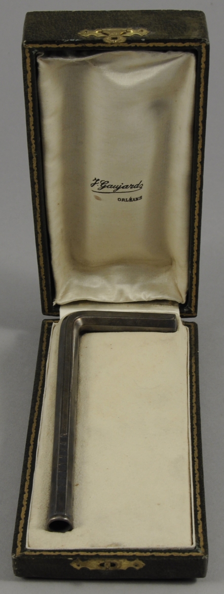 MANCHE D'OMBRELLE en métal argenté. Section octogonale, décor géométrique d'esprit Art Déco. Dans son coffret garni de tissu blanc marqué J. Gaujard Orléans.