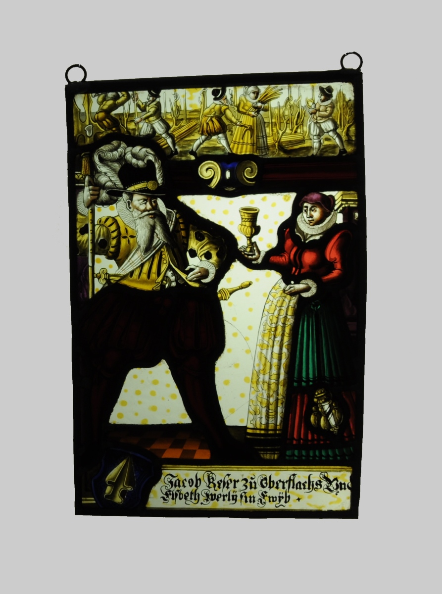 VITRAIL de forme rectangulaire en verres polychromes rehaussés de grisaille. Au centre est figuré un couple. L'homme, à gauche, tient une lance ; la femme, à droite, présente une coupe. Dans le bandeau supérieur sont figurés des hommes travaillant aux champs. Les noms des époux apparaissent dans le cartouche inférieur, en allemand et en gothique.