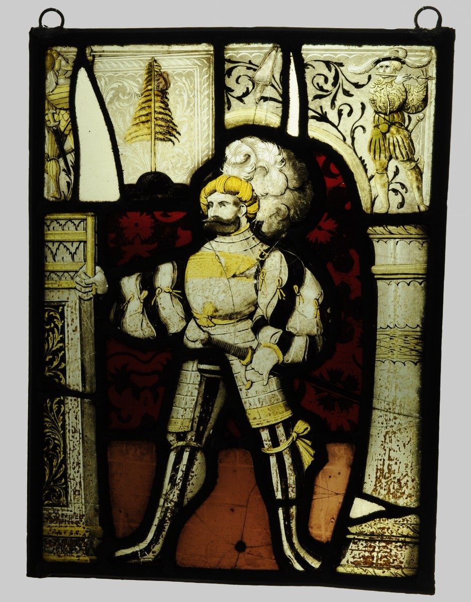 VITRAIL de forme rectangulaire en verres polychromes rehaussés de grisaille. Au centre est figuré un homme debout, en armure et tenue d'apparat, tenant une épée à la ceinture. Entourage de motifs divers, tels qu'un arbre où est perché un écureuil et un homme jouant de la flûte.