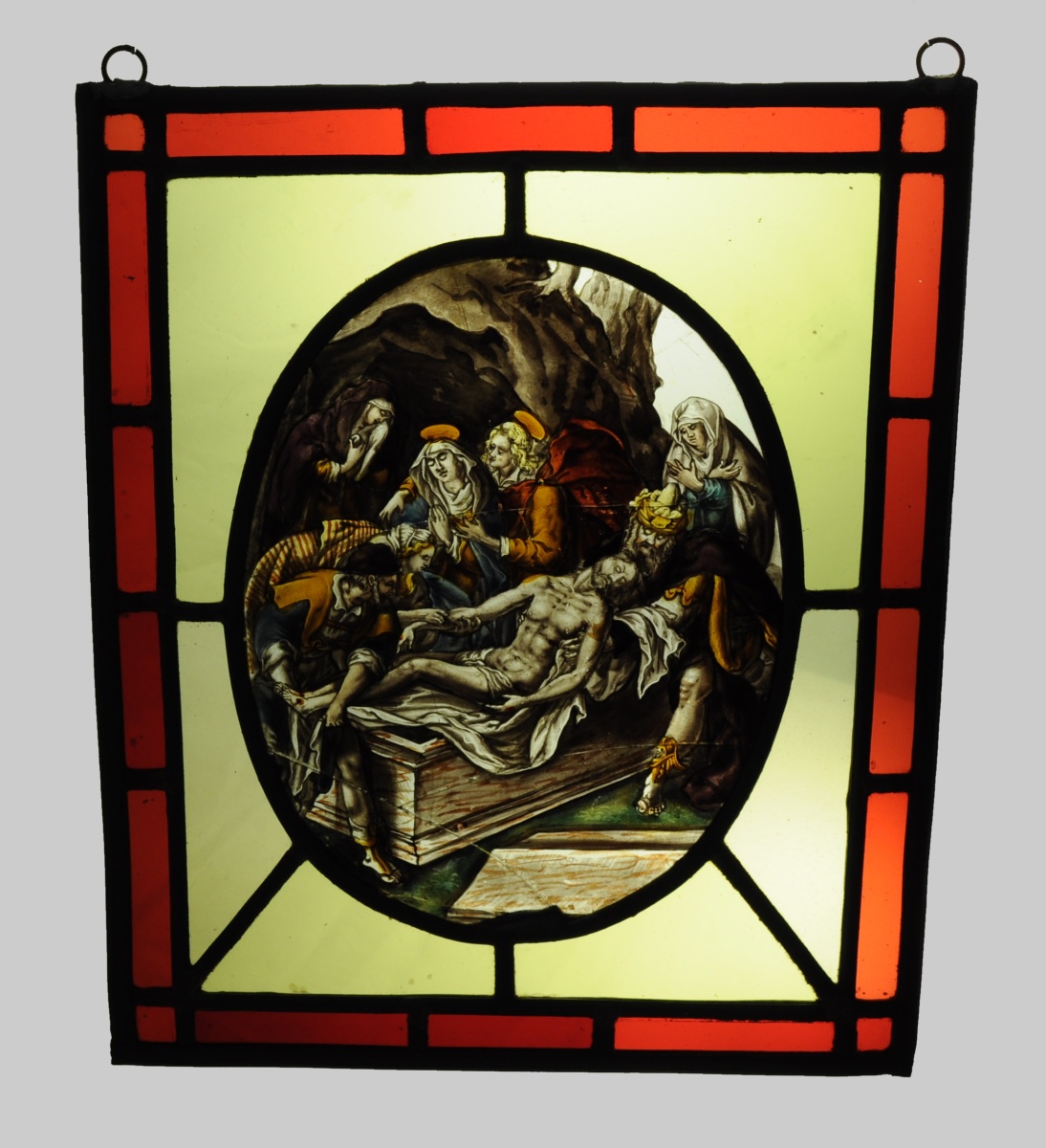VERRE PEINT ovale figurant la Mise au Tombeau. La Vierge, entourée des Saintes Femmes, est soutenue par saint Jean, tandis que Joseph d'Arimathie et Nicodème déposent le corps du Christ dans un tombeau. Polychrome.