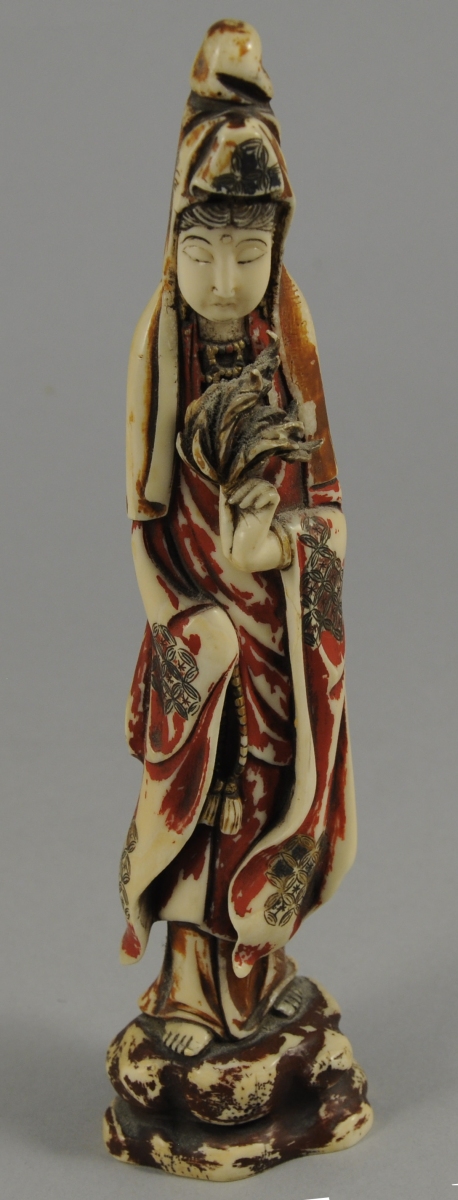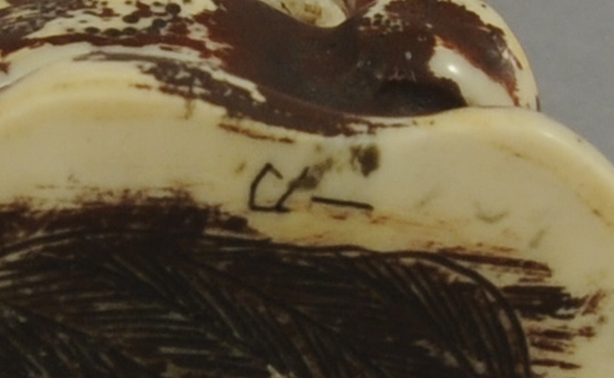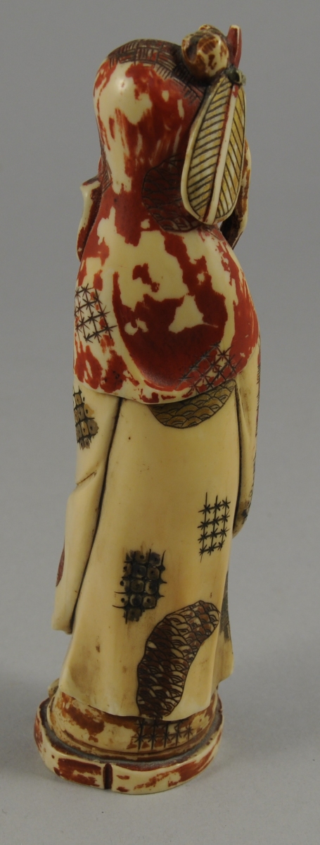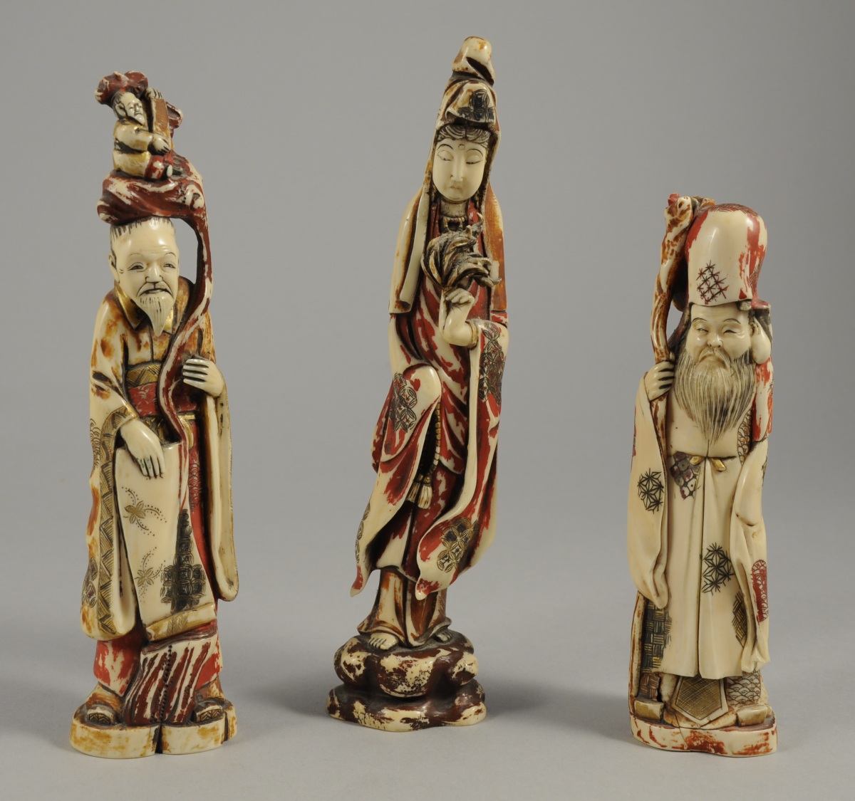 Réunion de 3 OKIMONOS en ivoire rehaussé de rouge et de dorure, représentant: