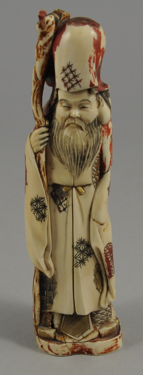 -un vieillard en tunique, coiffé d'un haut bonnet, tenant de la main droite un long bâton.