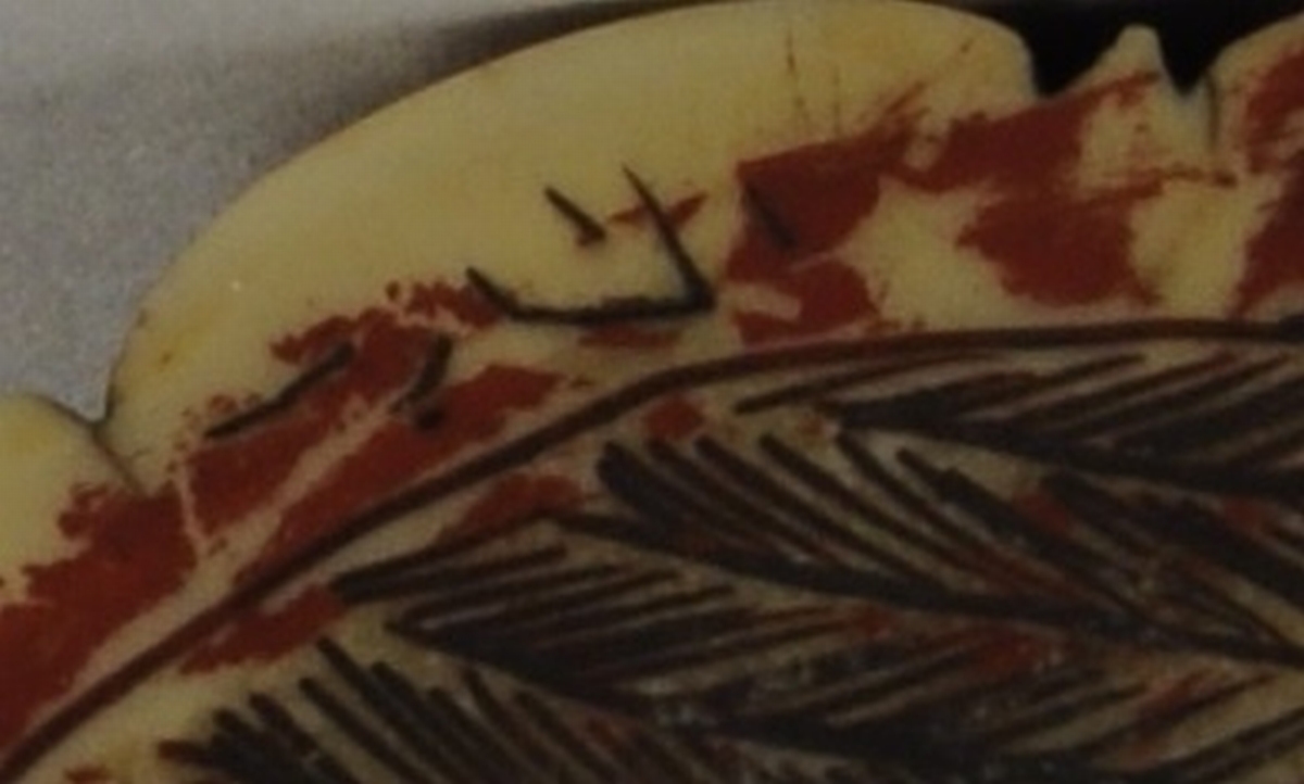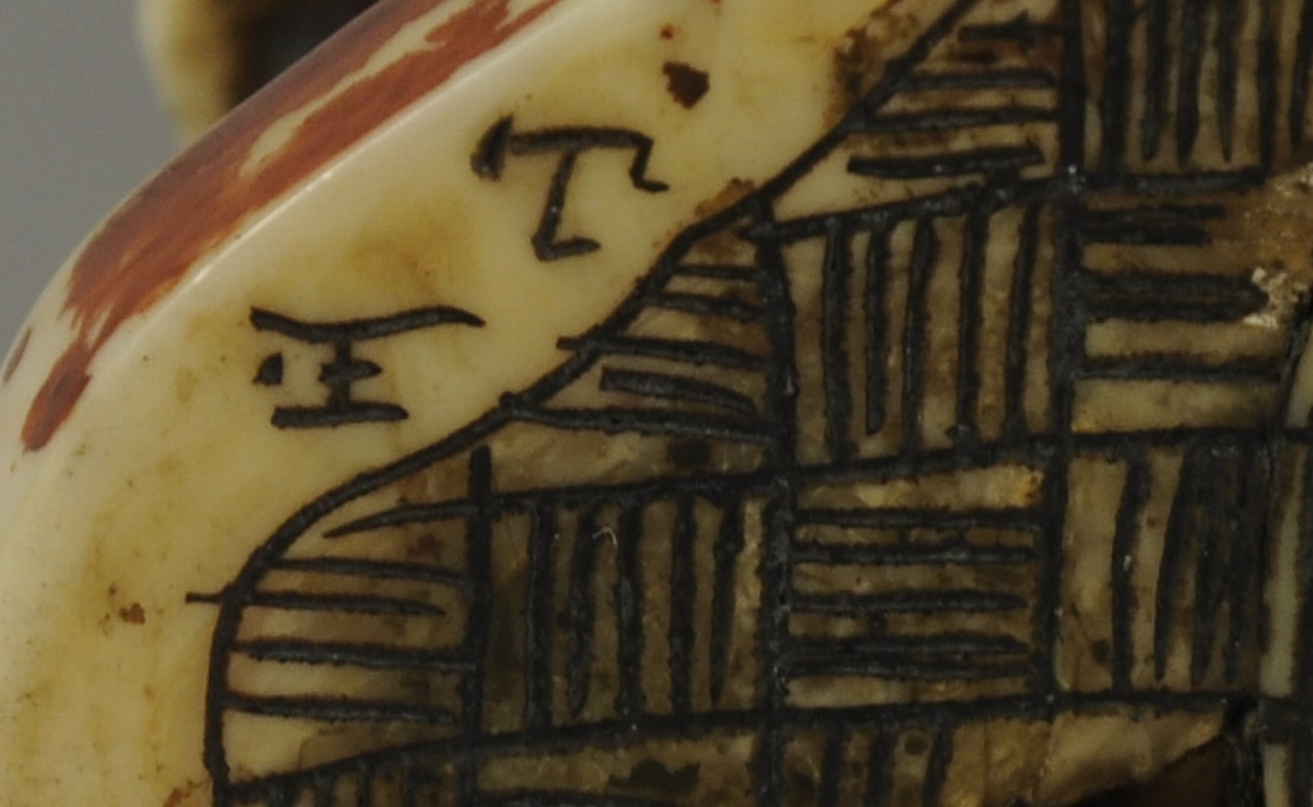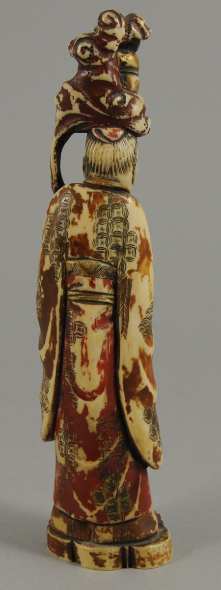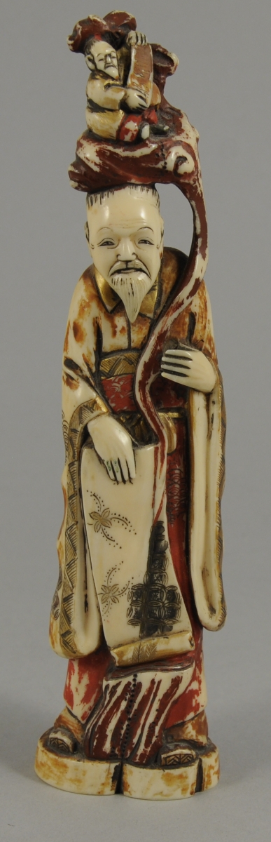 -un vieillard en tunique, tenant de la main droite un rouleau. Sur sa tête apparaît un petit personnage assis présentant un rouleau inscrit,