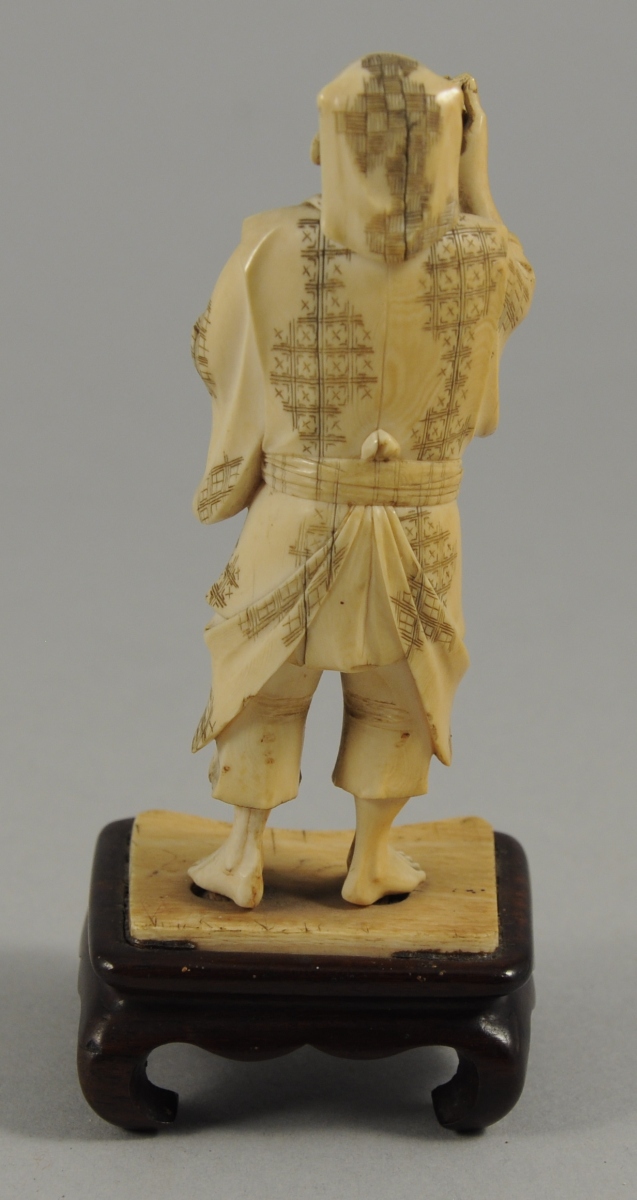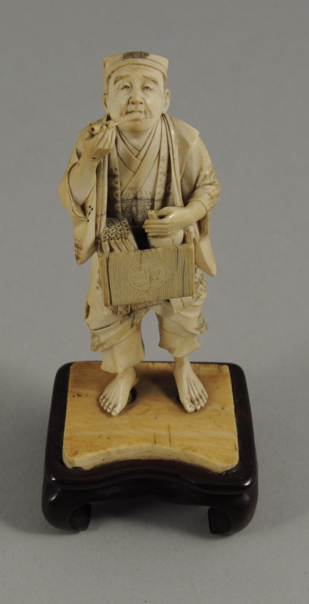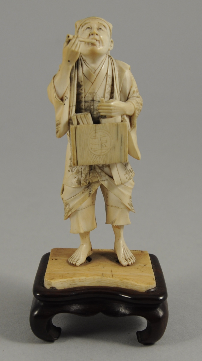 OKIMONO en ivoire, figurant un homme tenant en bandoulière un coffret contenant des sifflets, et portant à sa bouche l'un de ces sifflets. Sur un socle de bois sculpté.