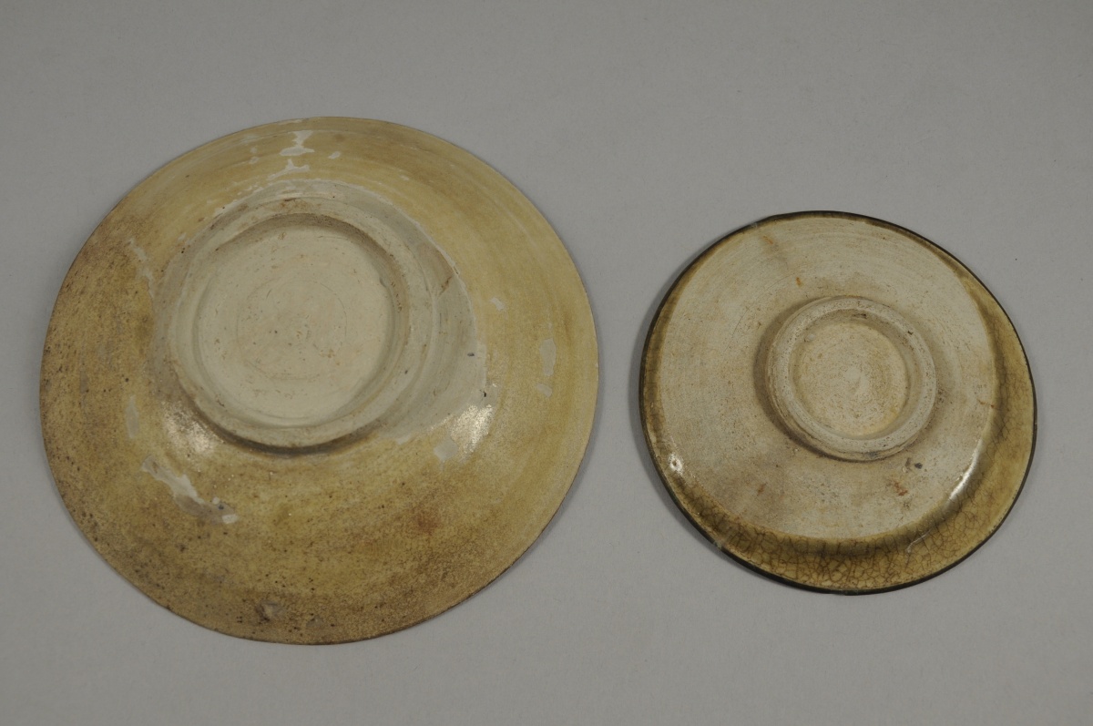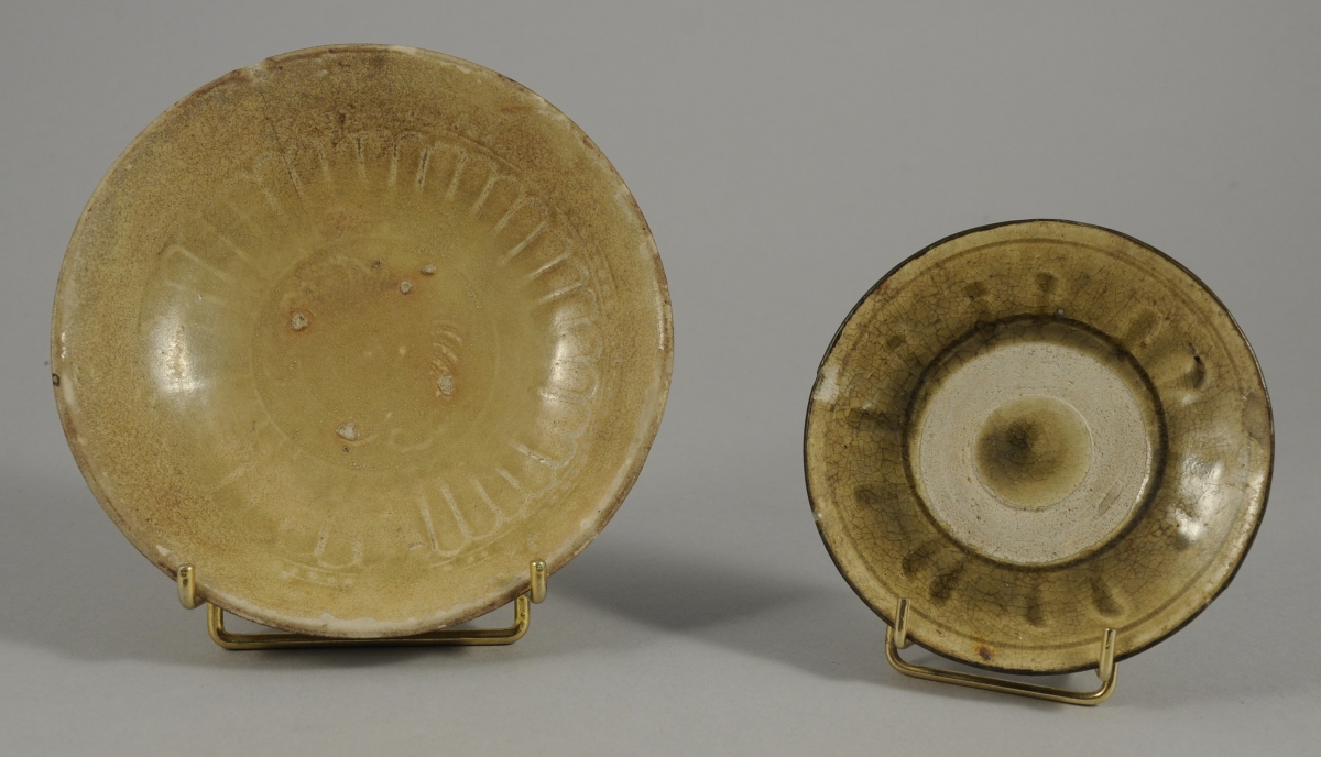 Réunion d'une petite COUPE et d'une SOUCOUPE en grès à décor incisé sous couverte beige et céladon.