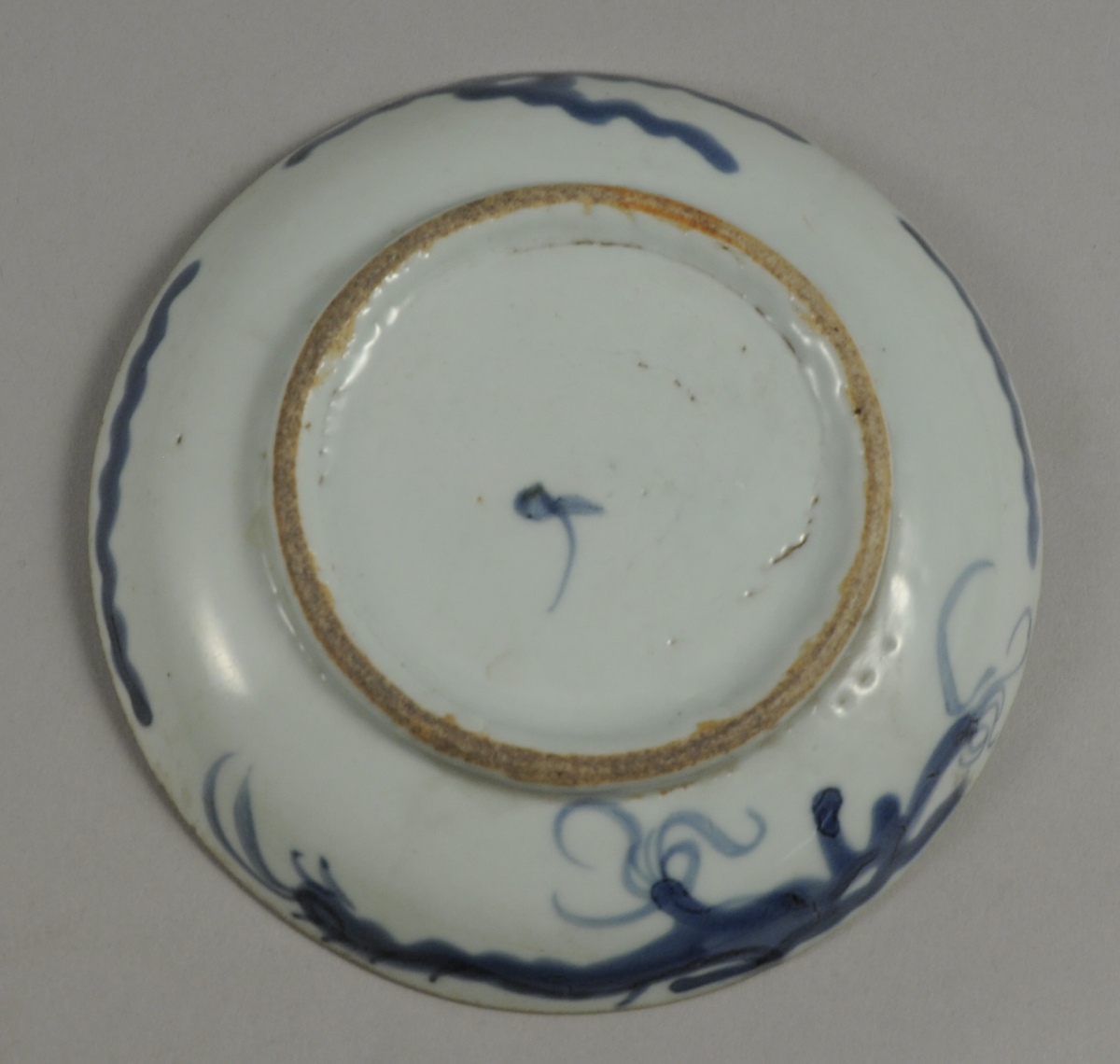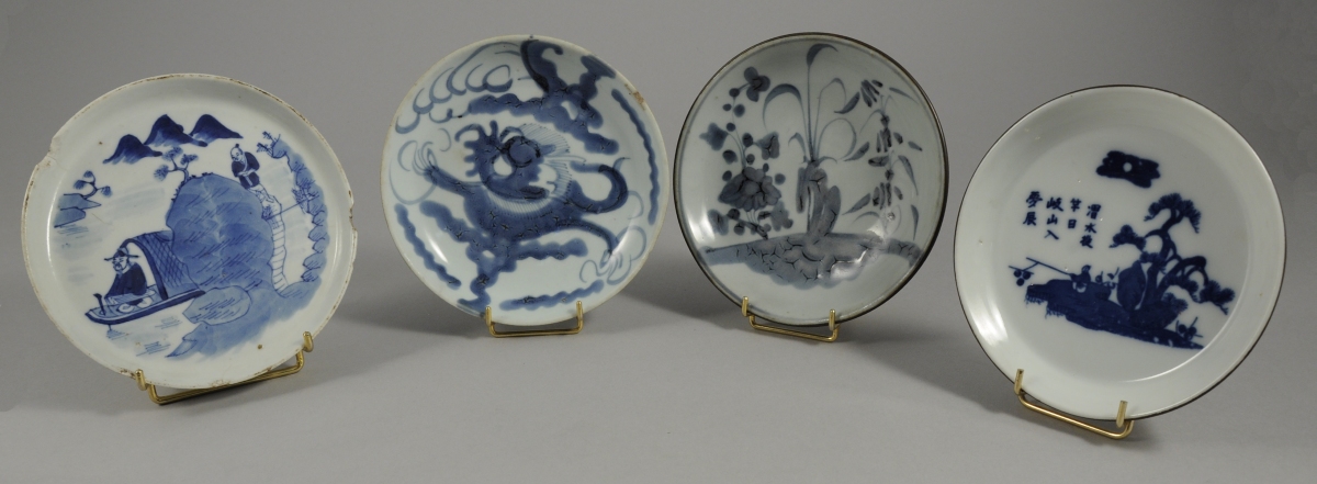 Réunion de quatre SOUCOUPES en porcelaine à décor en camaïeu de bleu, de motifs floraux ou de personnages dans des paysages.