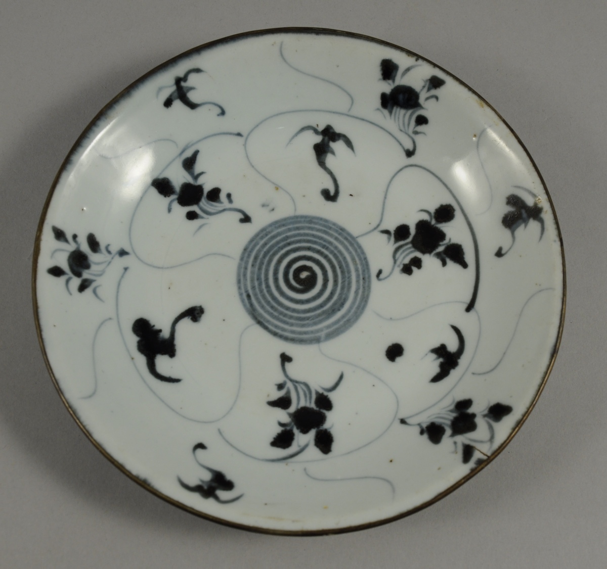 Réunion de deux SOUCOUPES en porcelaine à décor en camaïeu de bleu, de motifs floraux stylisés autour d'une spirale. Bordure cerclées de métal.