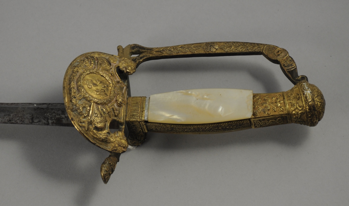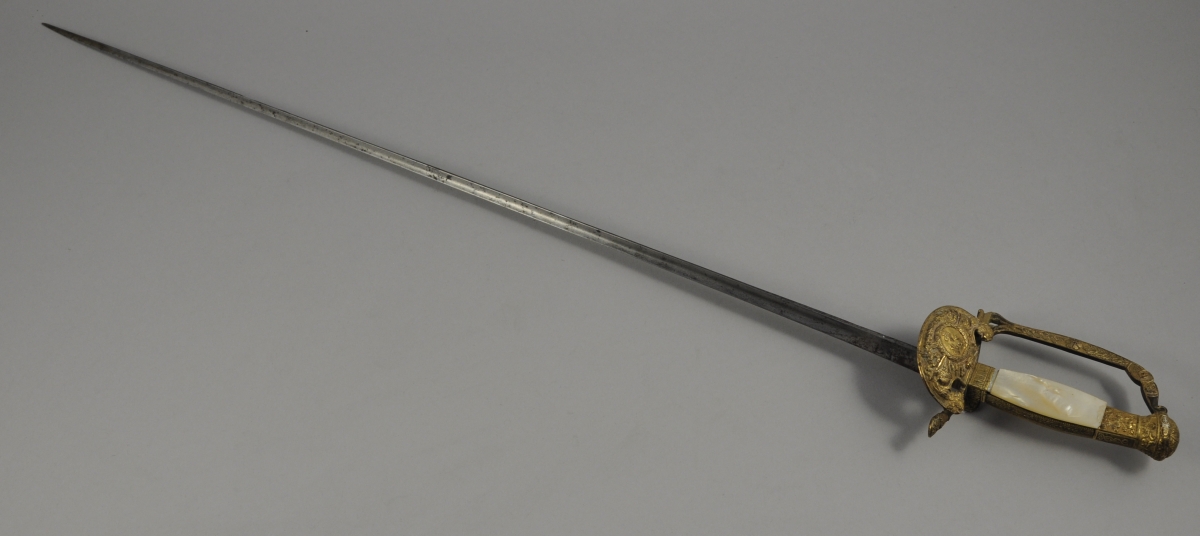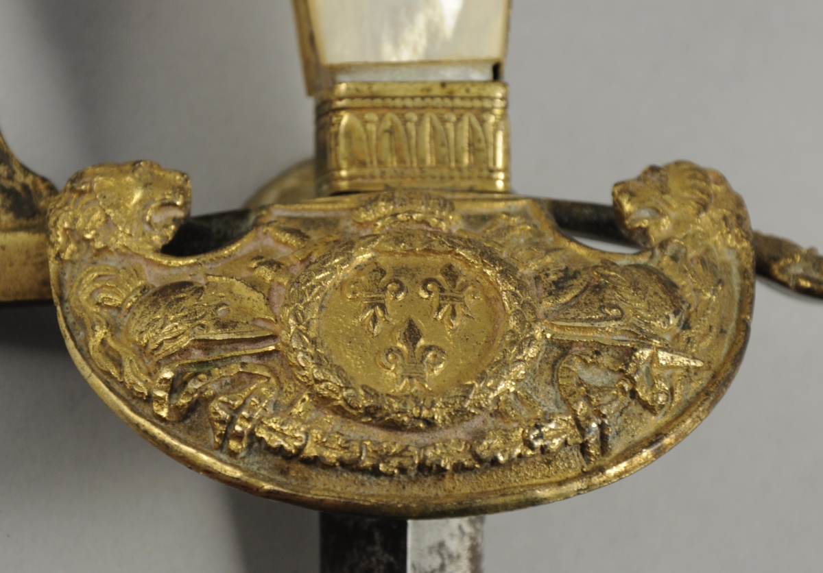 ÉPÉE à fusée garnie de plaques de nacre et garde à une branche en bronze doré et ciselé de palmes, de fleurs stylisées et d'un caducée. Clavier aux armes de France, entourées de trophées d'armes et de deux mufles de lions. Lame triangulaire gravée à sa base.