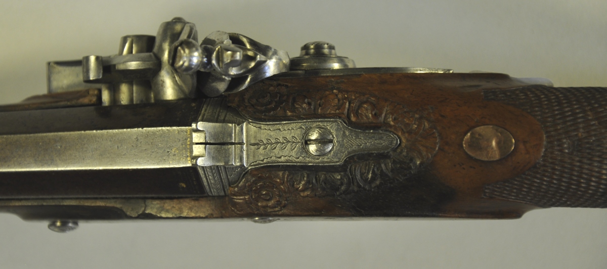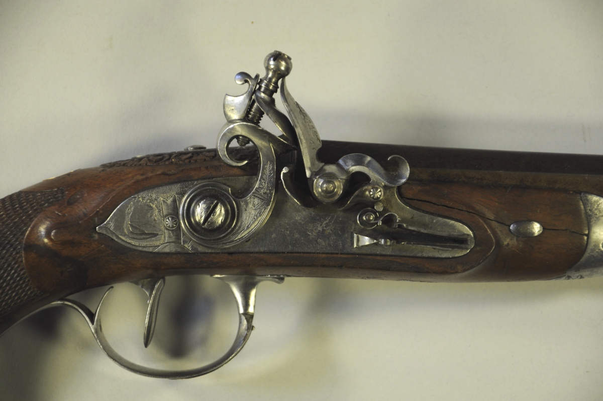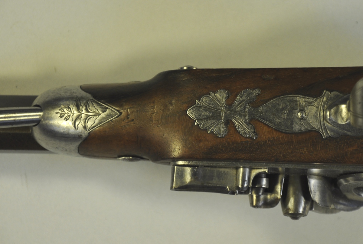 PISTOLET à silex. Platine marquée "CADET". Canon octogonal légèrement tromblonné. Motifs ciselés de fleurs, de canards et d'un petit paysage sur les platines. Crosse quadrillée en noyer, avec décor sculpté de fleurs et de feuilles à la base du canon.