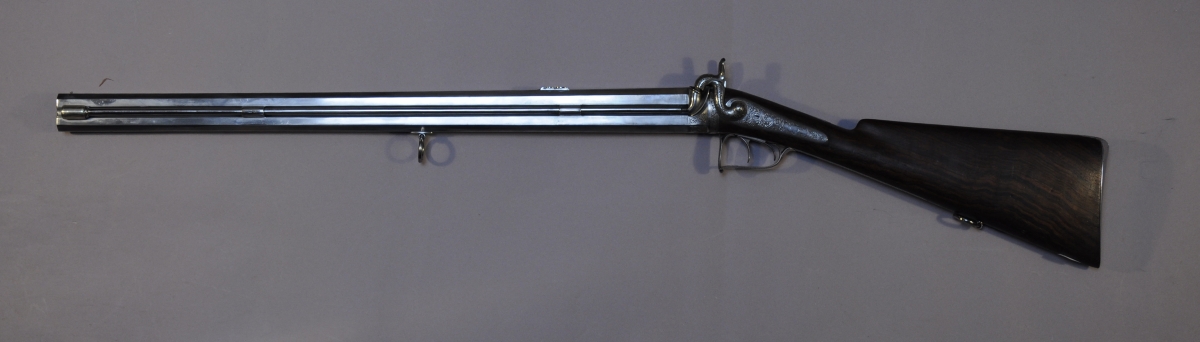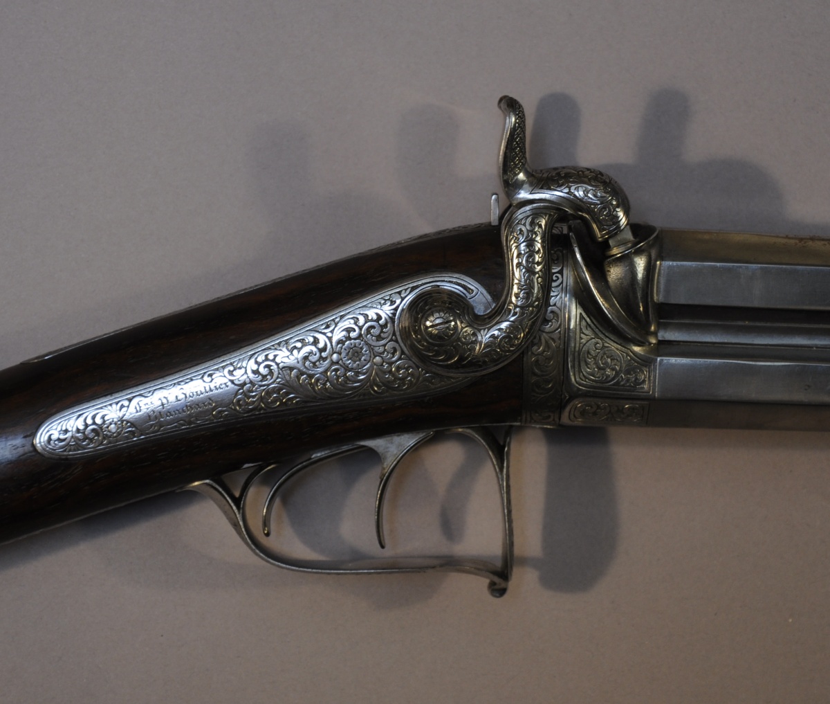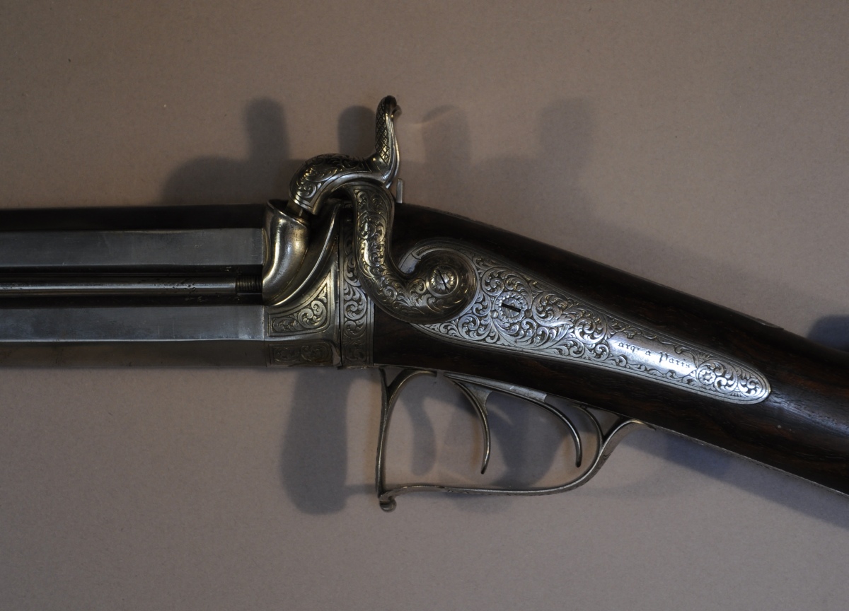 HOULLIER BLANCHARD. FUSIL de chasse à percussion. Deux canons octogonaux superposés, l'un lisse et l'autre rayé. Platines signées "Houllier Blanchard" et "Arq à Paris". Beau décor gravé de rinceaux au tonnerre, sur la platine, le pontet et les chiens. Crosse anglaise en noyer.