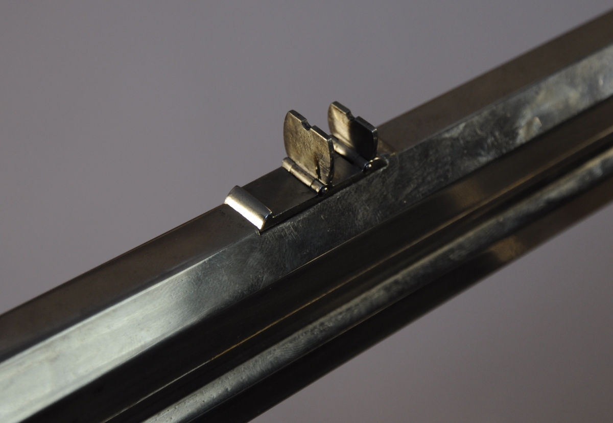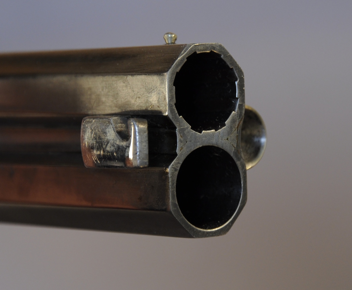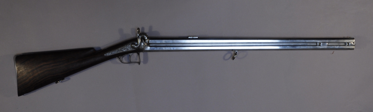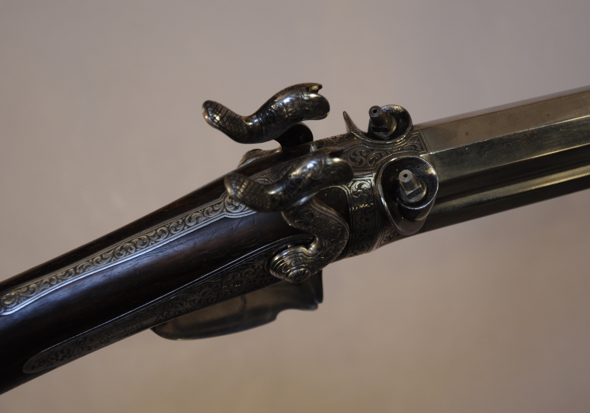 HOULLIER BLANCHARD. FUSIL de chasse à percussion. Deux canons octogonaux superposés, l'un lisse et l'autre rayé. Platines signées "Houllier Blanchard" et "Arq à Paris". Beau décor gravé de rinceaux au tonnerre, sur la platine, le pontet et les chiens. Crosse anglaise en noyer.