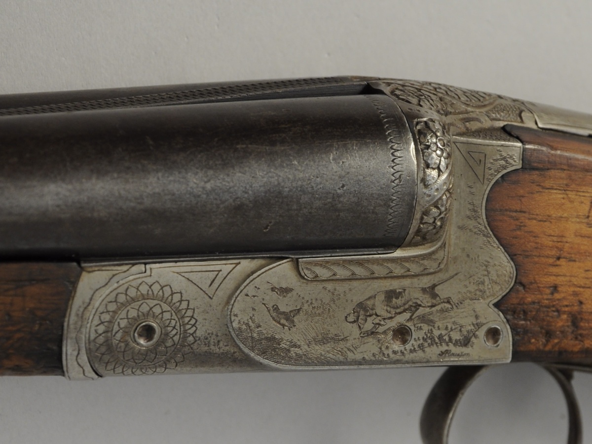 FUSIL DE CHASSE à canons juxtaposés, manufacture de Saint-Etienne. Calibre 16. Crosse demi-pistolet. Platines gravées de chiens débusquant des canards.