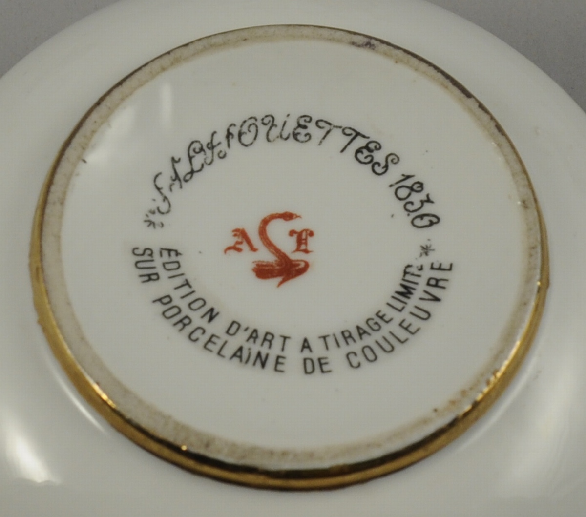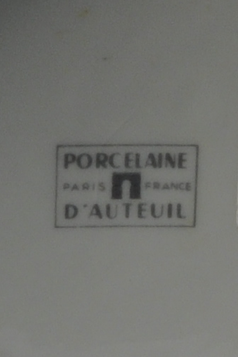 Joint: BONBONNIÈRE en porcelaine de Couleuvre, à décor floral et filets dorés. Diam. 10 cm ; POT COUVERT en porcelaine d'Auteuil, à décor d'une course hippique. Haut. 22 cm.