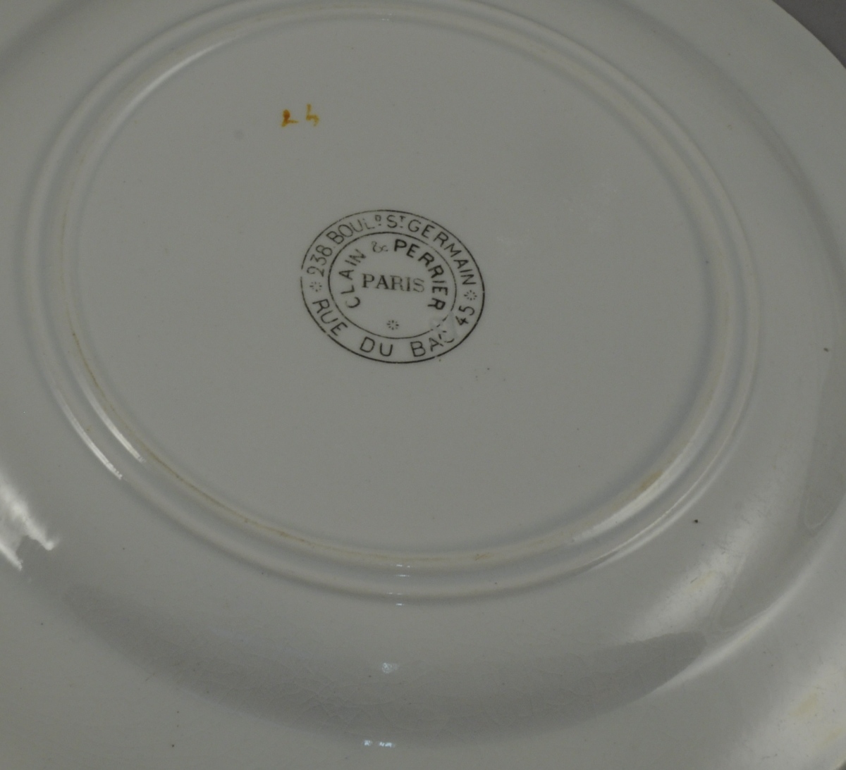 La plupart des pièces sont marquées au tampon de 1871-1875, ou au tampon figurant le monogramme de Gien, utilisé à partir de 1875. D'autres éléments portent le tampon du vendeur: Clain & Perrier, Paris, 238 Boul St-Germain, 45 Rue du Bac.