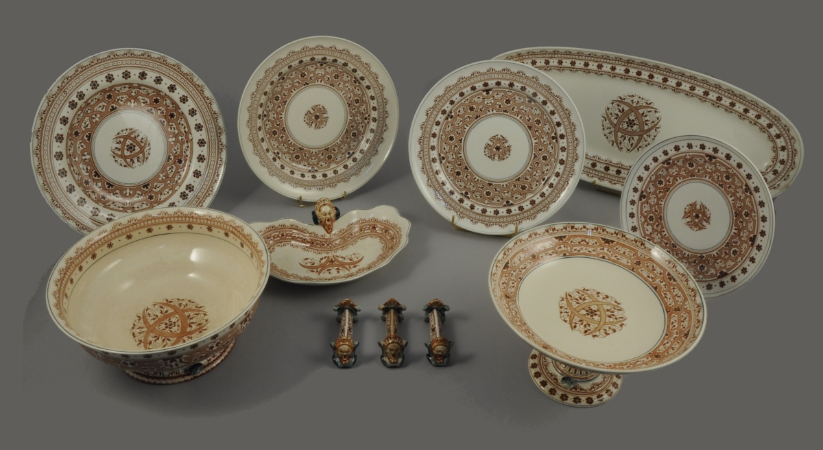Faïence fine. Le modèle, dit "Henri II", porte trois croissants entrelacés, emblèmes du roi. Il s'inspire de la céramique de Saint-Porchaire et présente des entrelacs, rinceaux et godrons. Des rehauts verts ornent les éléments en relief, tels que les prises en forme de mascarons sur les pièces de forme.