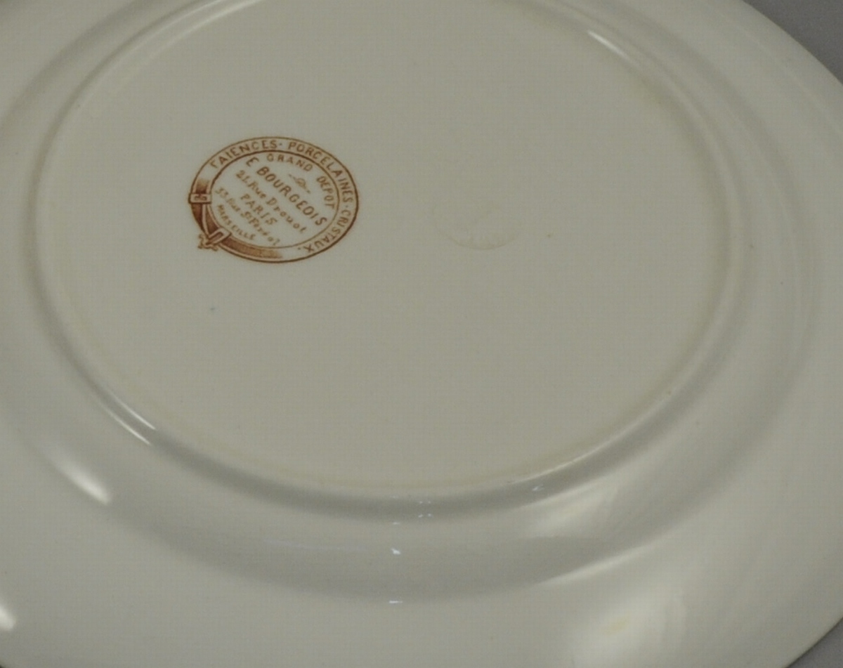 Certaines pièces portent la marque du service: dans un grand H apparaissent les feuilles de houx ardent stylisées, et la mention Longwy - Henri II. D'autres pièces portent la marque du vendeur, E. Bourgeois, 21 rue Drouot à Paris.