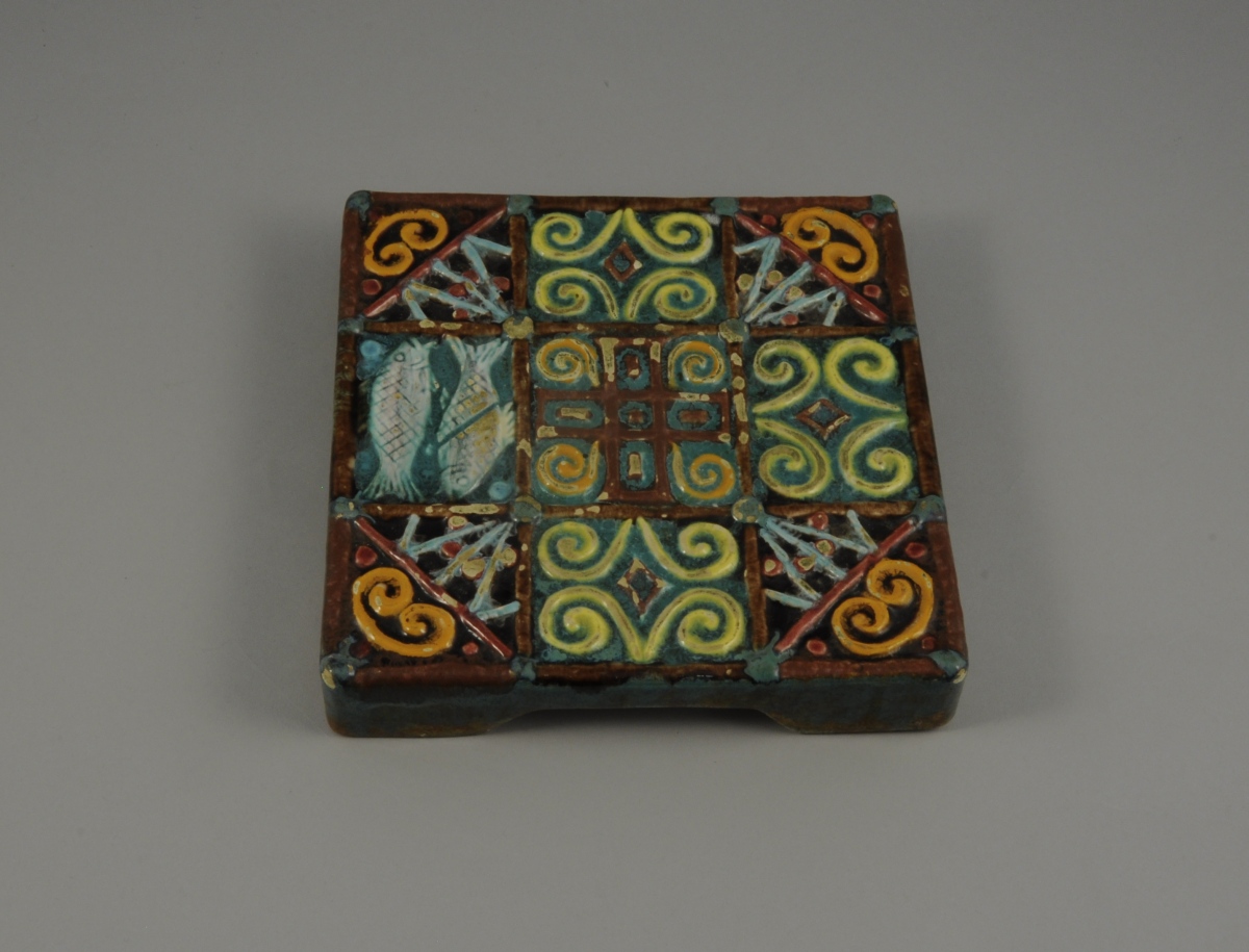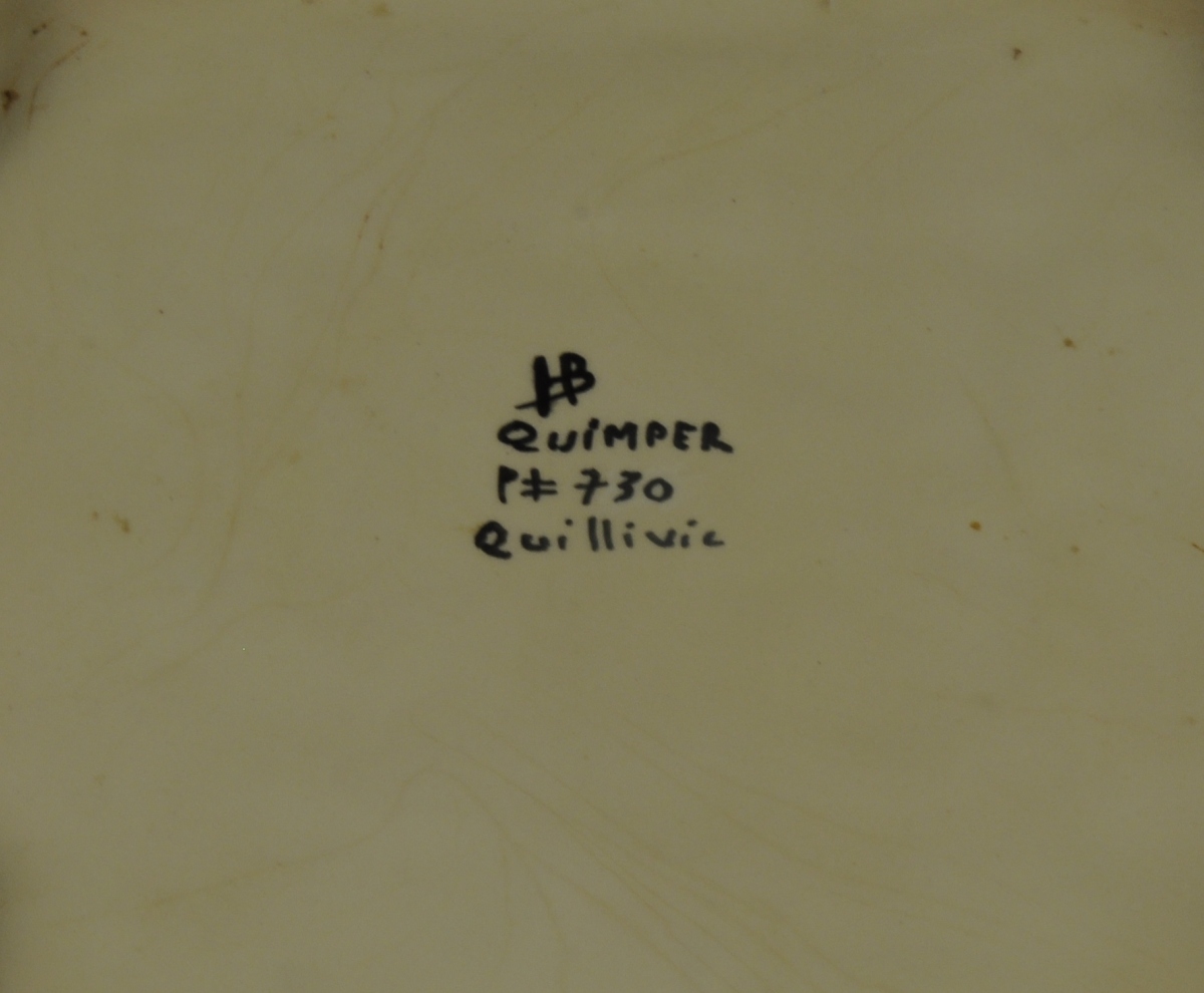 HB QUIMPER. DESSOUS DE PLAT en faïence polychrome, de forme rectangulaire à décor moulé de poissons et de signes celtes. Signé et numéroté "P+730 / Quillivic".