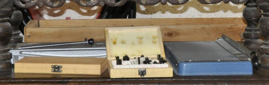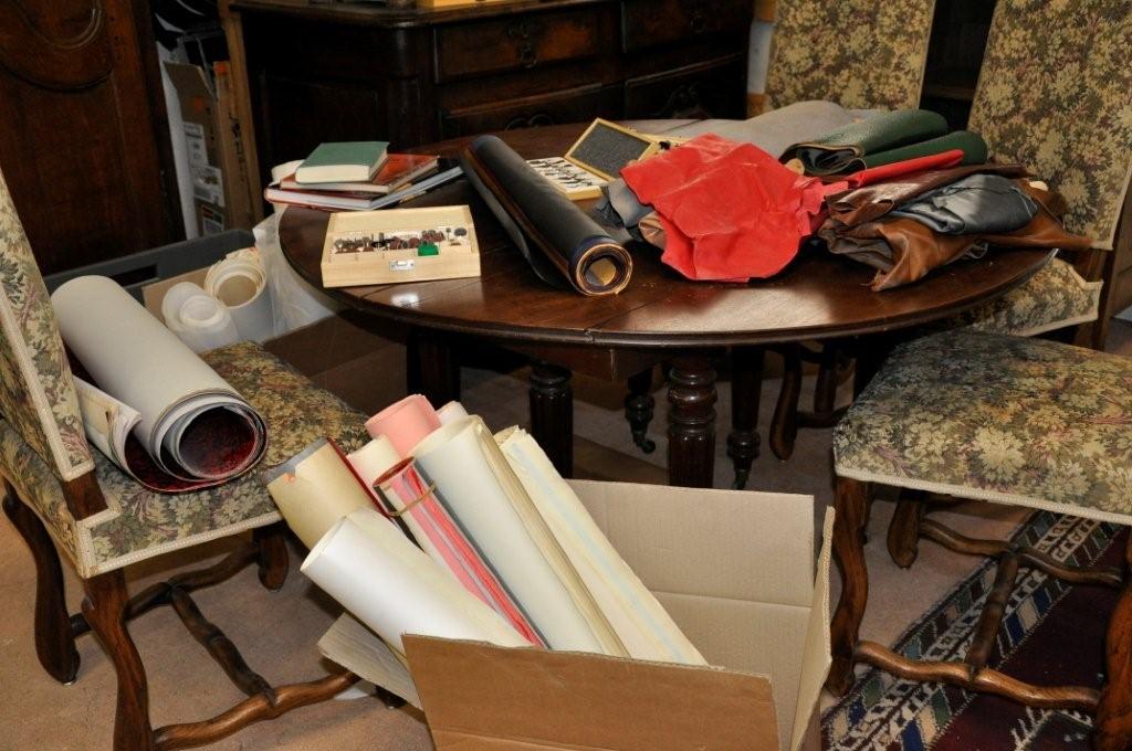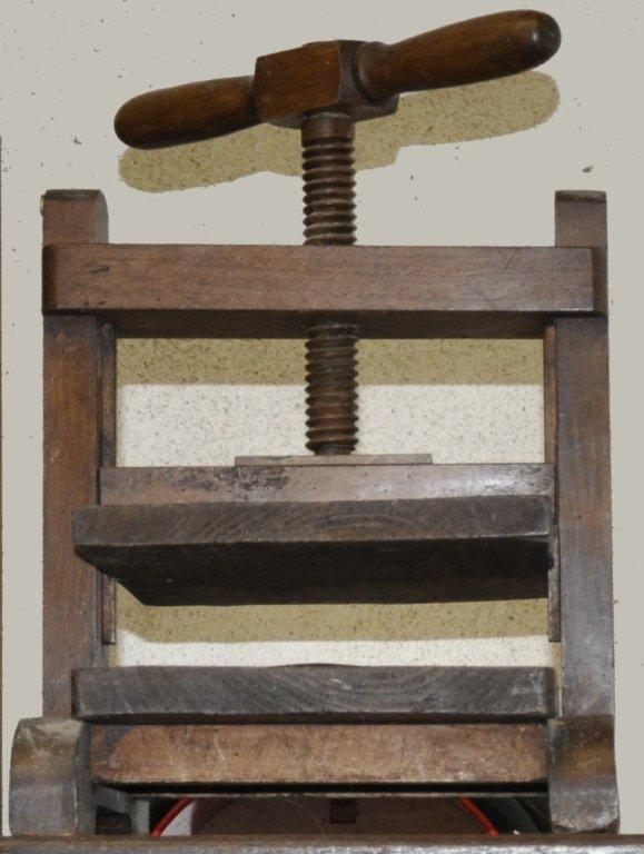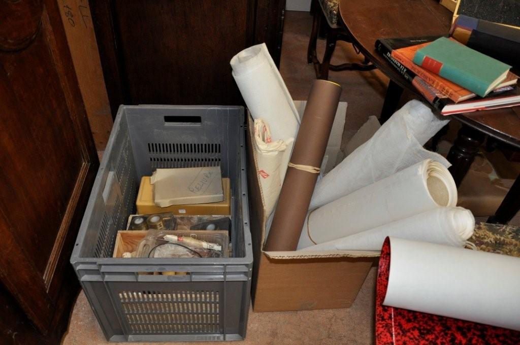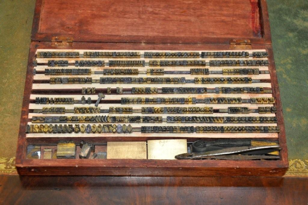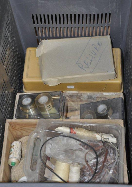 ATELIER DE RELIURE comprenant: une presse, des fers à dorer, du papier, des chutes de cuir, des rouleaux d'or et des ouvrages sur la reliure.