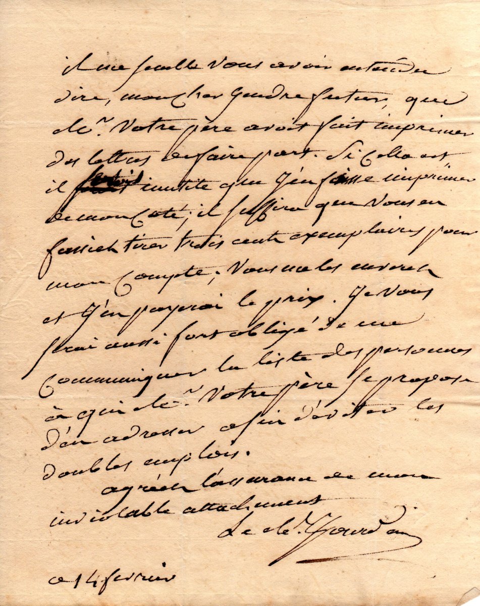 CORRESPONDANCE FAMILIALE. Il exprime sa satisfaction à la nomination de son gendre à l'emploi de chef d'escadron d'état-major (8 juillet 1818), conseille à sa fille de comparer sa position à celle de personnes moins bien partagées qu'elle (3 août 1818), entretient le comte Lemercier des sommes dues à Baptiste pour la dot de Sophie (3 août, 14 et 18 octobre 1825), évoque des petits-enfants, commissions, fêtes de famille