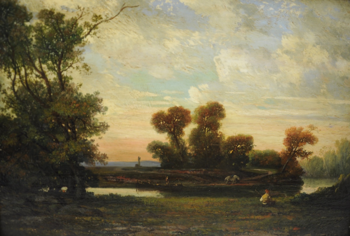 Paysage animé, fleuve et chemin de halage.