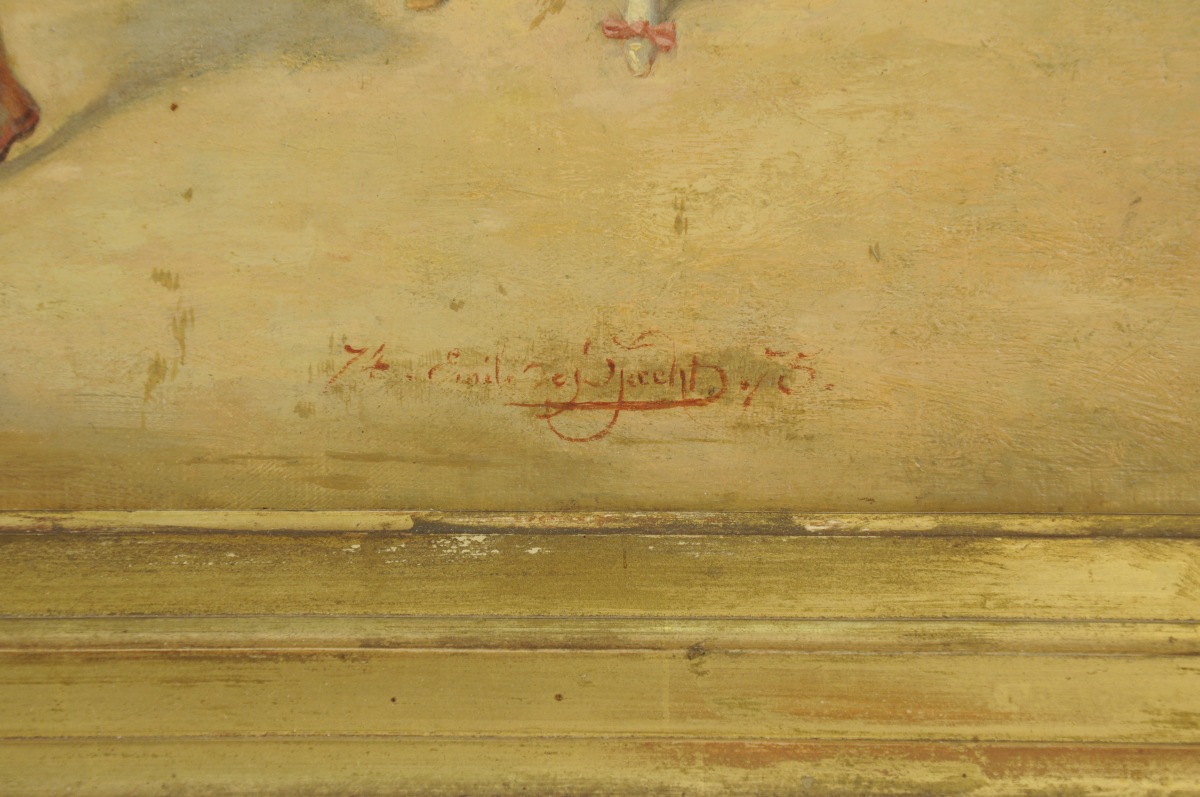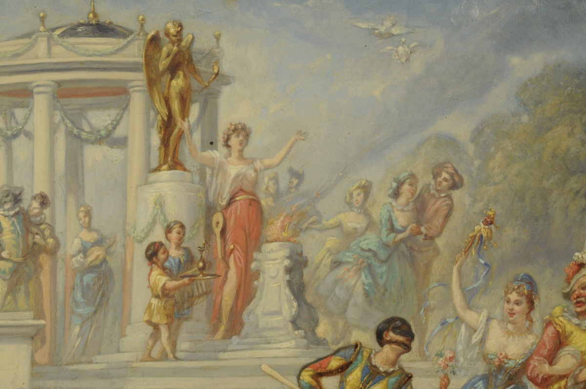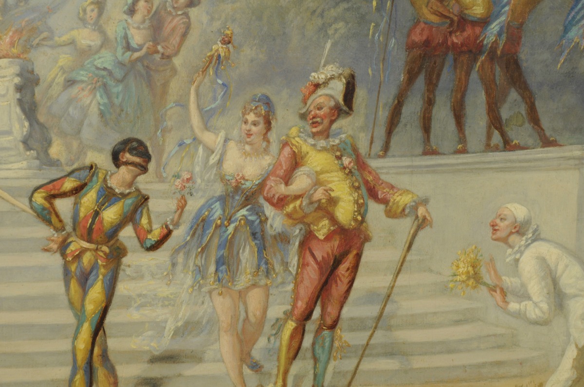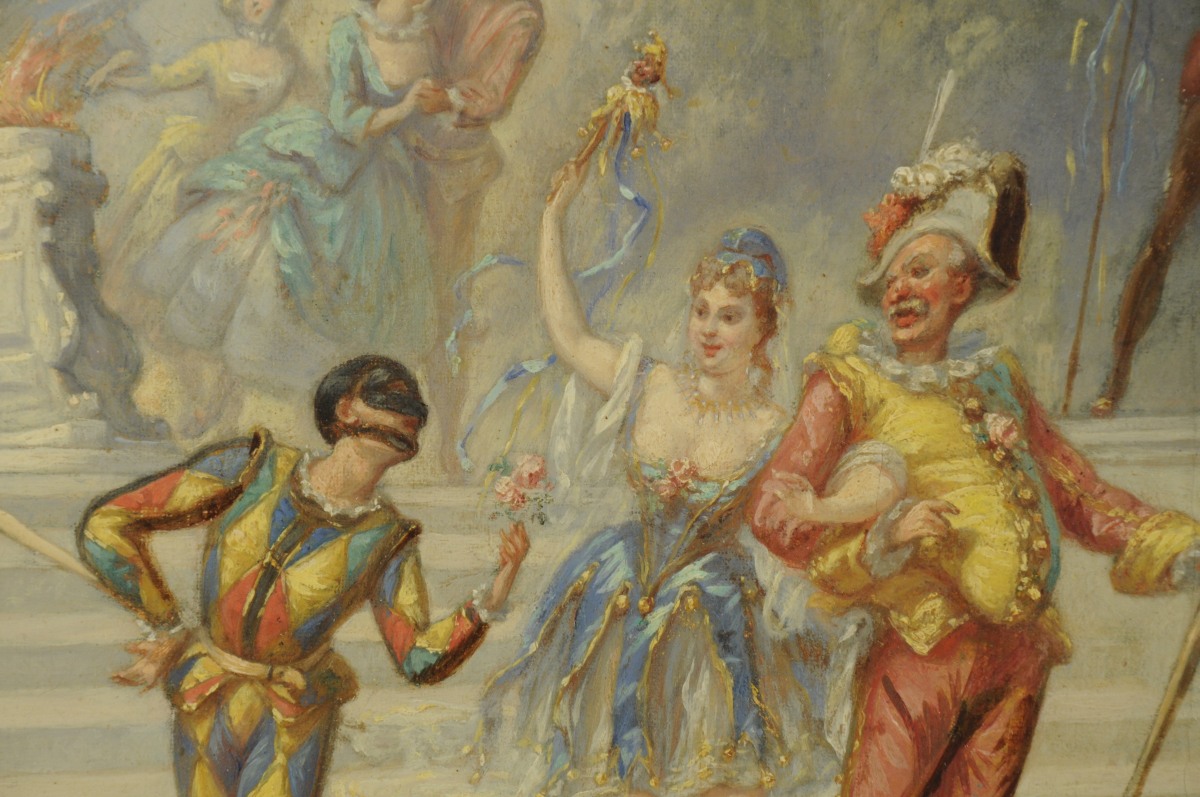 Élève de Cogniet et de Barrias à l'école des Beaux Arts de Paris, de SPECHT débute au salon en 1865, se spécialisant dans la peinture de genre et les paysages urbains. Ses diverses vues des Grands Boulevards parisiens trouvent une résonnance dans ce "Mariage de Polichinelle" réalisé en 1874/75. De SPECHT représente le héro fourbe de la Commedia dell Arte Napolitaine entouré d'une foule de personages plus grotesques et plus plaisants les uns que les autres.