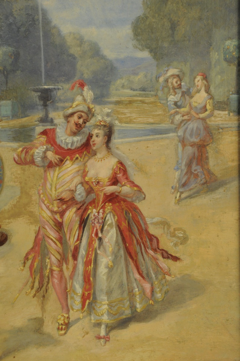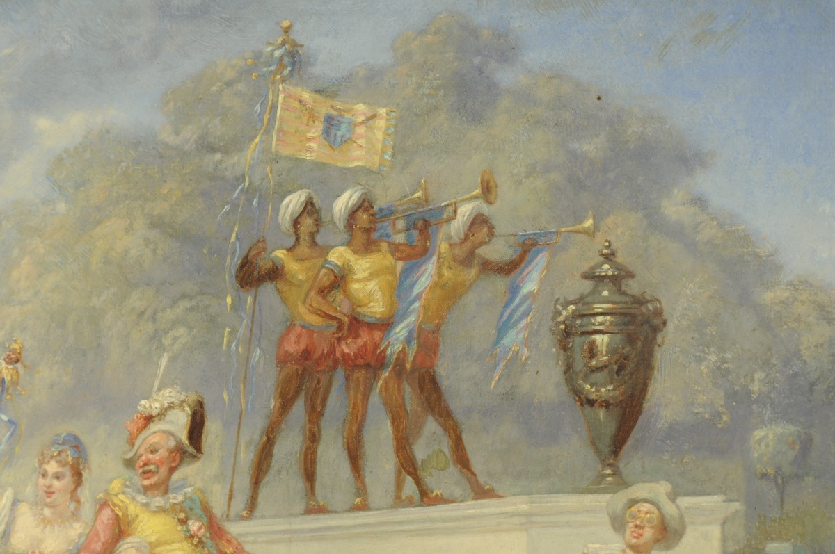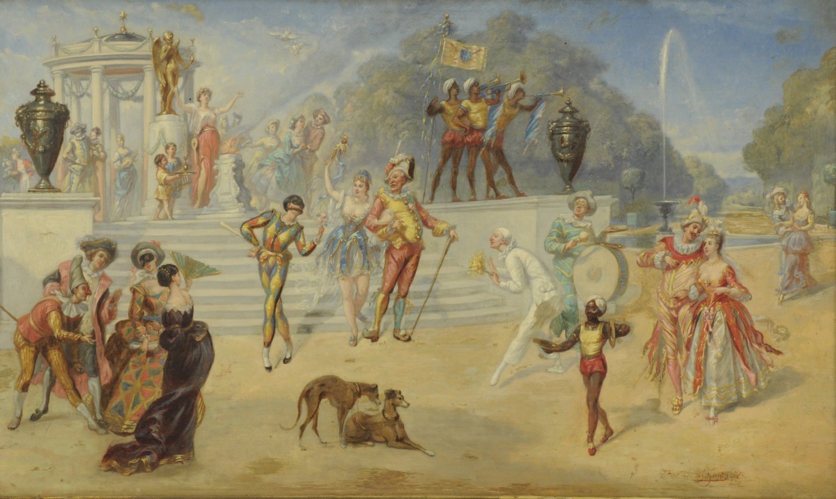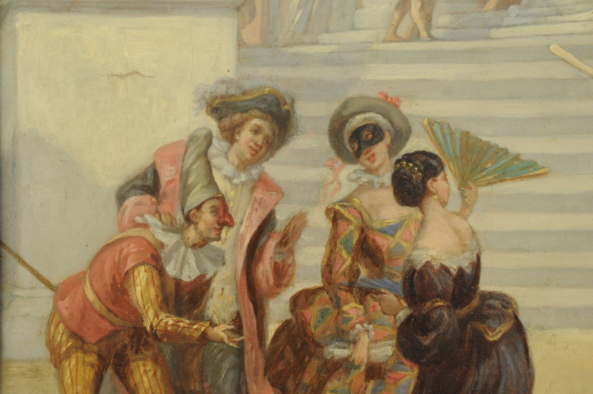 Élève de Cogniet et de Barrias à l'école des Beaux Arts de Paris, de SPECHT débute au salon en 1865, se spécialisant dans la peinture de genre et les paysages urbains. Ses diverses vues des Grands Boulevards parisiens trouvent une résonnance dans ce "Mariage de Polichinelle" réalisé en 1874/75. De SPECHT représente le héro fourbe de la Commedia dell Arte Napolitaine entouré d'une foule de personages plus grotesques et plus plaisants les uns que les autres.