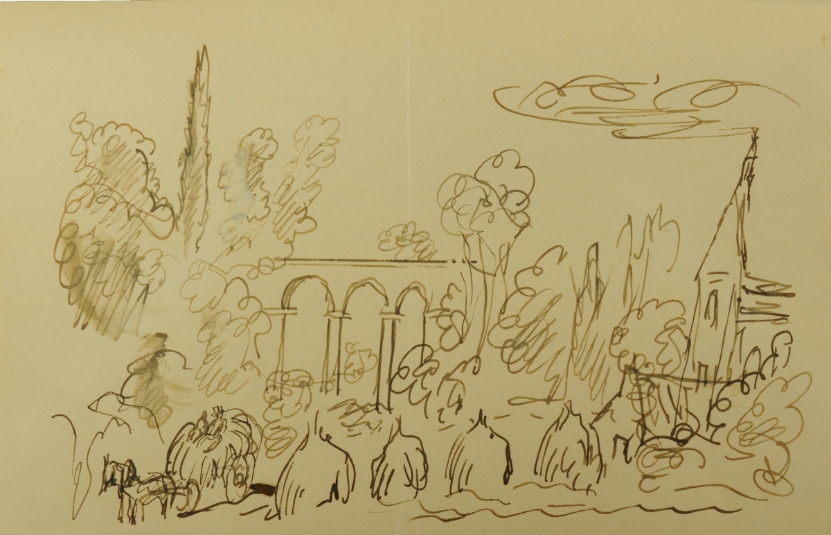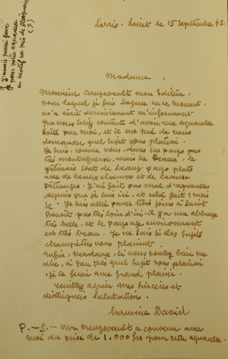 Joint correspondance avec dessin à l'encre, en date du 15 septembre 1942, de Lorris, Loiret. 17,5 x 22 cm.