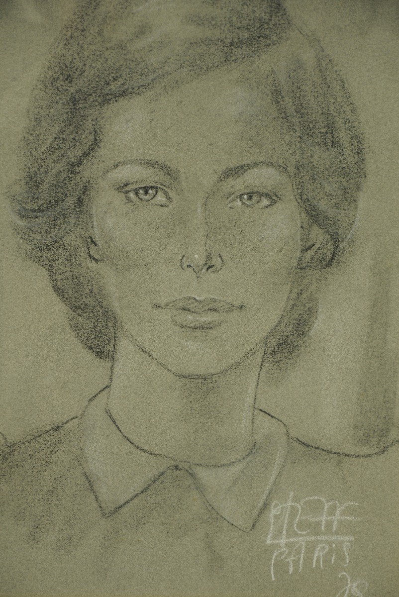 - Portrait de femme. Pierre noire et craie blanche. Signé Steff, Paris, 78.