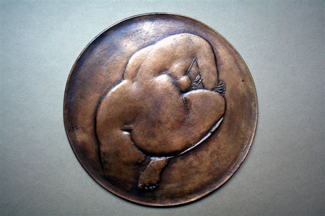 MÉDAILLE en bronze, Ø 190 mm, signée VOLTI, représentant un nu féminin à l'avers et au revers. SUP.