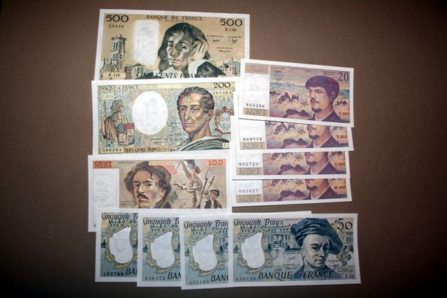 Lot: FRANCE, 11 billets dont: 20 F Debussy (4), 50 F Quentin la Tour (4), 100 F Delacroix (1), 200 F Montesquieu (1), 500 F Pascal (1). SUP.