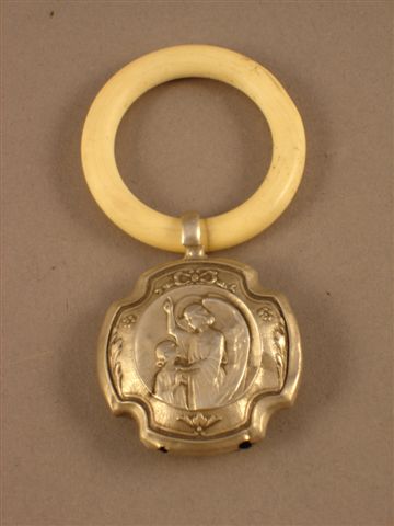 HOCHET en forme de croix, centré d'une scène religieuse. Argenté. Anneau. Poids brut 11 g.