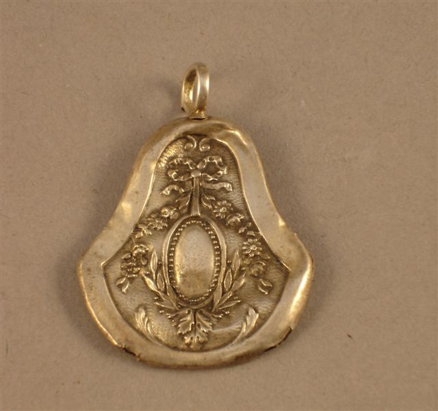 HOCHET en forme de médaillon piriforme, centré d'un décor de ruban de style Louis XVI. Argenté. Anneau. Poids brut 4 g.