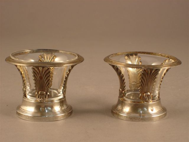 PAIRE DE SALERONS en argent. Le récipient en verre, de forme conique, est contenu dans une monture d'argent constituée de quatre palmettes s'étirant du col à la base en doucine.