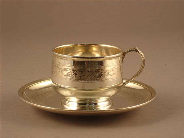 TASSE ET SA COUPELLE en argent. Une frise de feuilles de laurier entrelacées orne la panse de la tasse et l'aile de la soucoupe. Prise feuillagée. Poinçon Minerve.Travail moderne.