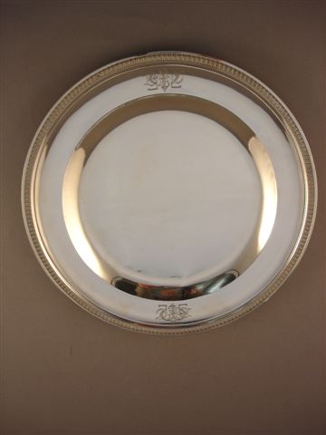 PLAT en argent de forme ronde. L'aile soulignée par une frise de feuilles d'eau. Porte le monogramme BECM. Poinçon Minerve. Style Empire. Diam. 33 cm. Poids 935 g.
