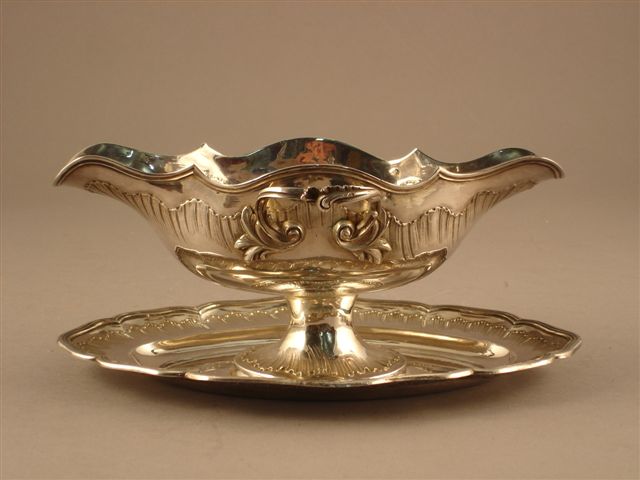 SAUCIÈRE en argent de forme mouvementée. Le col découpé, souligné d'une double mouluration, la panse ornée de rocailles. Prises latérales feuillagées. Elle repose sur un plateau chantourné, mouluré et orné de rocailles. Poinçon Minerve. Style Louis XV. Haut. 11, larg. 26, prof. 16 cm. Poids 602 g.
