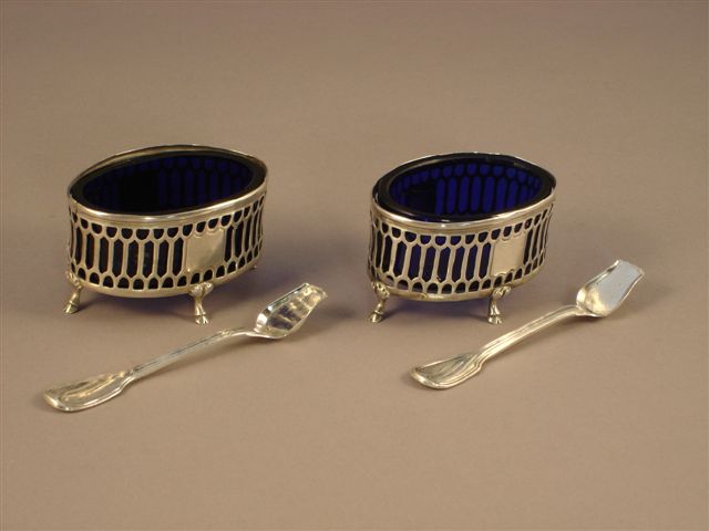 PAIRE DE SALIÈRES en argent et verre bleu. Chaque salière se compose d'un saleron en verre bleu prenant place dans une monture d'argent de forme ovale portée par quatre pieds de biche. Le corps, en argent repercé, est orné à la ceinture d'une frise ajourée. Sur les faces principales, des médaillons aveugles en forme d'écu. Les cuillers à sel présentent un modèle à double filet, et le cuilleron en forme de pelle à feu porte le monogramme JC. Maître orfèvre indéterminé.