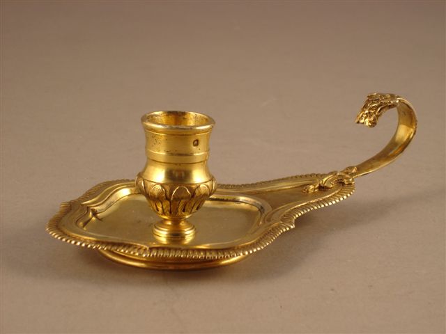 BOUGEOIR de chevet en vermeil, posant sur une base chantournée gravée d'une frise de godrons. Le binet cylindrique à renflement et ceinture médiane décoré de feuilles d'eau. Le manche fait d'une languette à enroulement en forme de satyre. Poinçon Minerve.