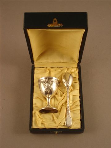 COQUETIER ET SA CUILLÈRE en argent. Poinçon Minerve. Fin XIXème siècle. Haut. du coquetier: 6,5 cm. Poids 40 g. Dans un coffret en cuir vert