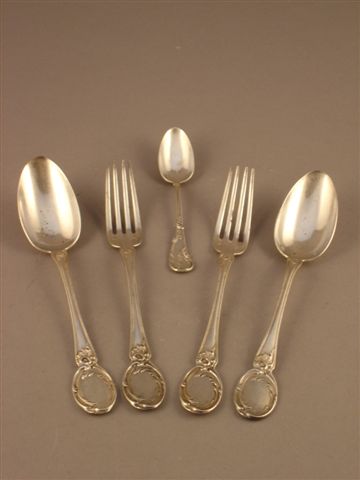 LOT DE 2 COUVERTS DE TABLE en argent et une cuillère à dessert. Riche répertoire iconographique de style Rocaille: rinceaux feuillagés, coquilles et enroulements de volutes. Poinçon Minerve. Style Louis XV. Napoléon III. Poids 330 g.