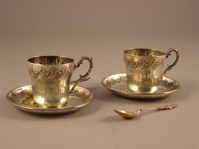 PAIRE DE TASSES ET SOUS-TASSES et leurs CUILLERS en argent ciselé de côtes torses à décor de feuillages stylisés sur le haut de la panse de la tasse et l'aile de la coupelle. L'anse, fondue et rapportée, formée par enroulement successif de volutes, est agrémentée de feuilles d'acanthe. Gravées d'un double monogramme AD et MD. Les cuillères présentent un riche répertoire iconographique de style Rocaille avec spatule agrafée d'enroulements et de coquilles. Poinçon Minerve. Style Louis XV. Milieu XIXème siècle. Haut. 6,5 cm pour l'ensemble. Diam. 11 cm pour la coupelle. Poids 305 g.