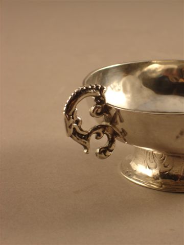 COUPE DE MARIAGE dite "à quêter" en argent uni. Elle repose sur une large bâte à décor estampé de rinceaux et présente deux anses perlées à profil de dauphins. La partie supérieure de la panse, sous le col, ciselée de "Fse CRASSIN". Poinçon de maître orfèvre incomplet, répété trois fois. Peut-être s'agit-il de Louis ALLIOT, reçu maître en 1668.