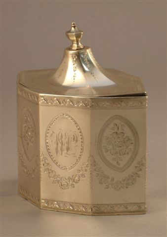 BOÎTE À THÉ de forme losangique à pans en argent gravé. Maître orfèvre: probablement Charles ALDRIDGE, reçu en 1786. Londres 1795-1796. Réparations, accidents, dégravée et regravée. Poids: 348 g.